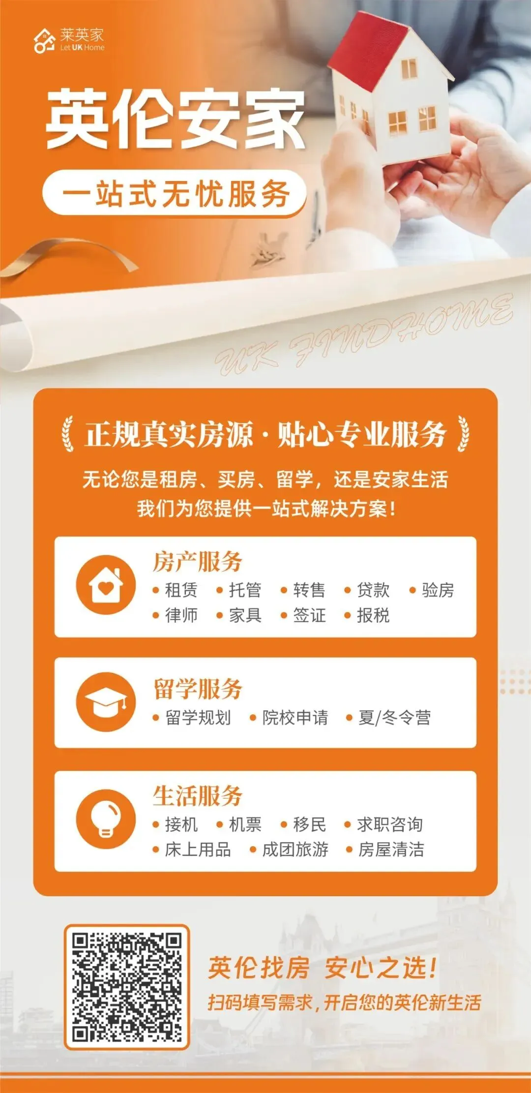 作为深耕英国房产数年的中介,我们为您提供一站式管家服务,帮房东应对房源管理时会出现的各类挑战,助租客入住理想居所,让您在英国房产租赁中更省心、更放心!