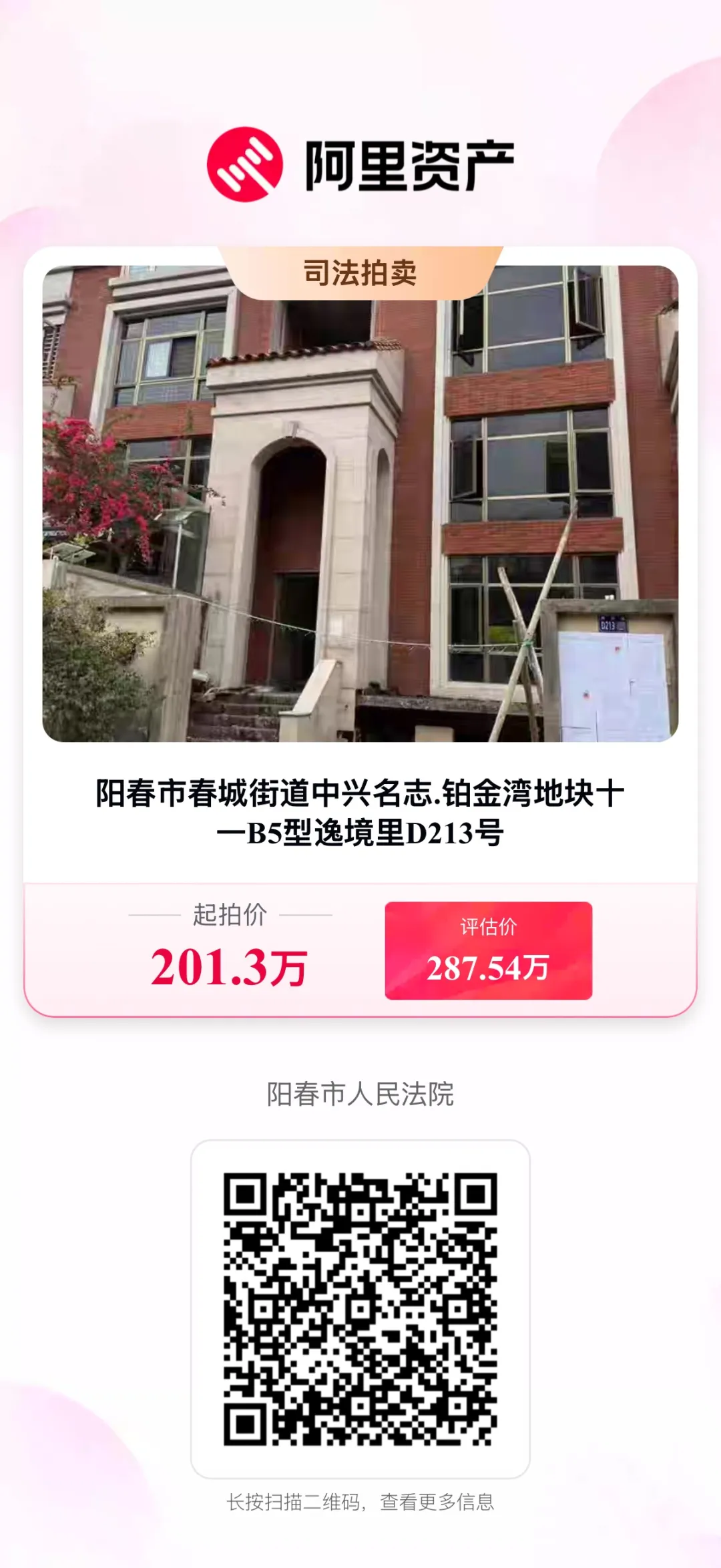 拍卖标的:阳春市春城街道中兴名志.铂金湾地块十一B5型逸境里D213号
