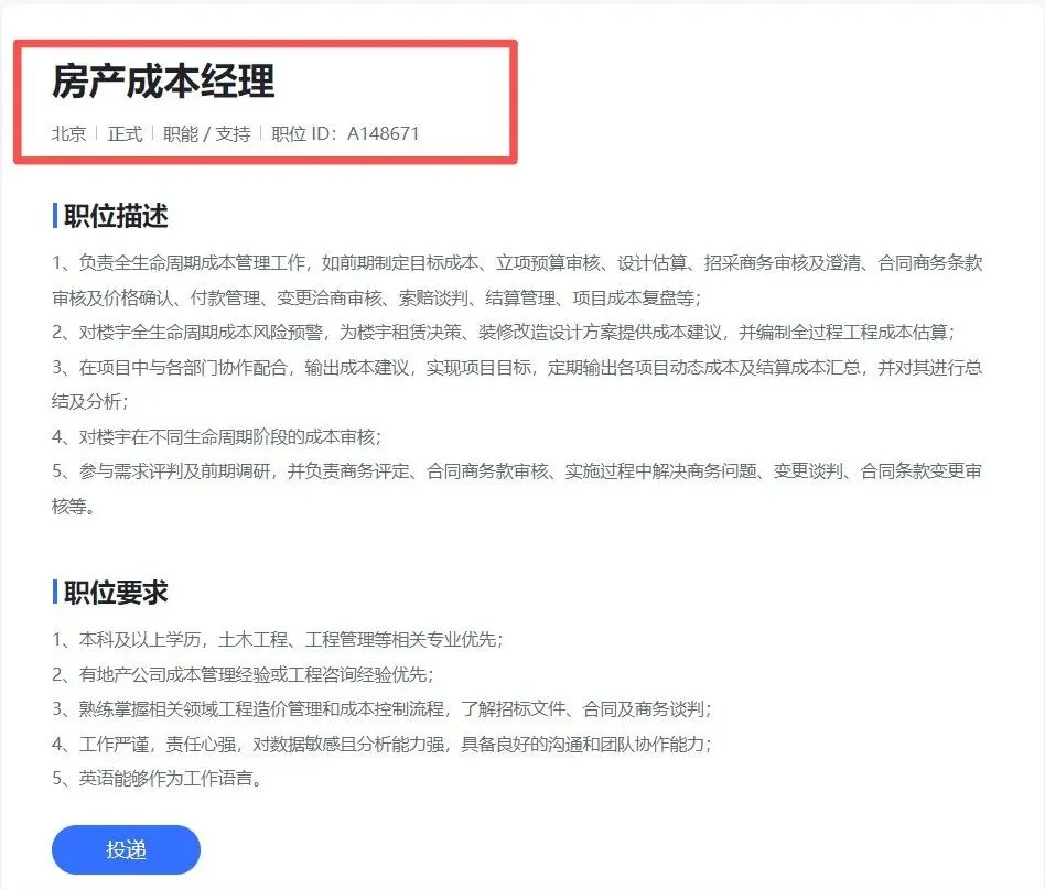 2、有地产公司成本管理经验或工程咨询经验优先;