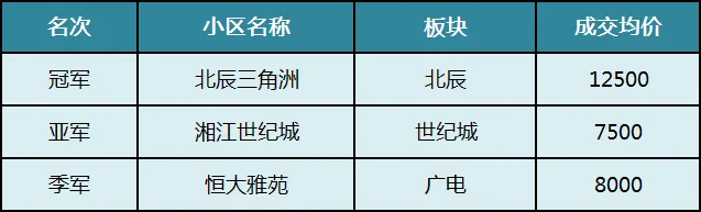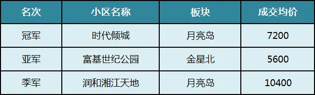 望城销冠是时代倾城,规模大、地铁口,配套长郡双语白石湖,价格7千左右;排第三的润和湘江天地位于月亮岛板块核心,是次新小区,成交均价过万,是望城刚改、改善的选择。