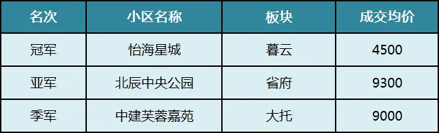 天心区销冠是均价仅4千多的怡海星城,位于南城暮云,位置偏远,但价格非常香,小高层容积率偏低,环境宜居,配套民办双书包。北辰中央公园位于省府板块,大型次新小区;中建芙蓉嘉苑位于1号线正地铁口,中信-奥莱商圈,自建仰天湖品牌小学。