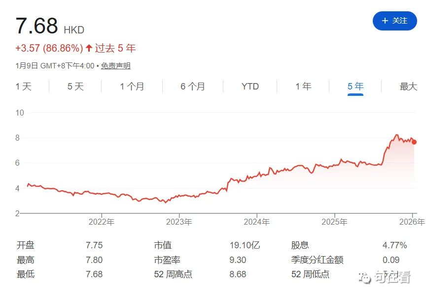 公司在香港上市,1月9日股价为7.68港元,近5年股票上涨了86.86%。