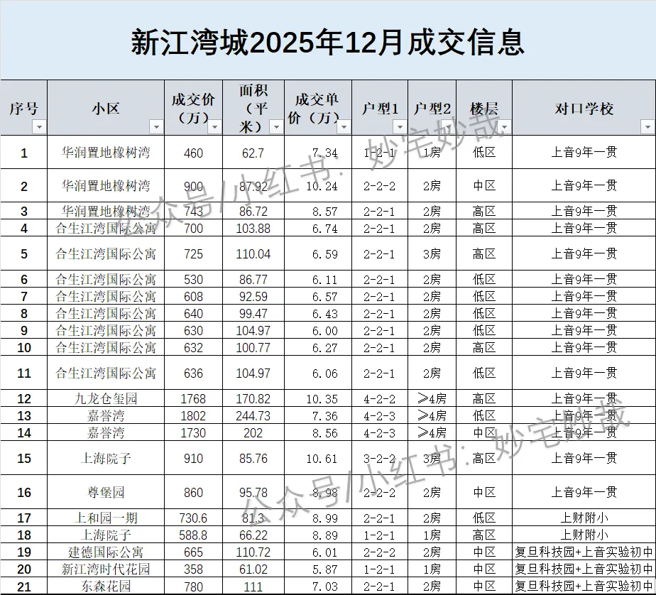 1.2025年12月新江湾累计成交21套,环比11月35套下降40%,