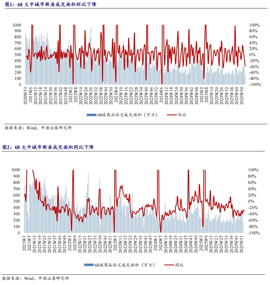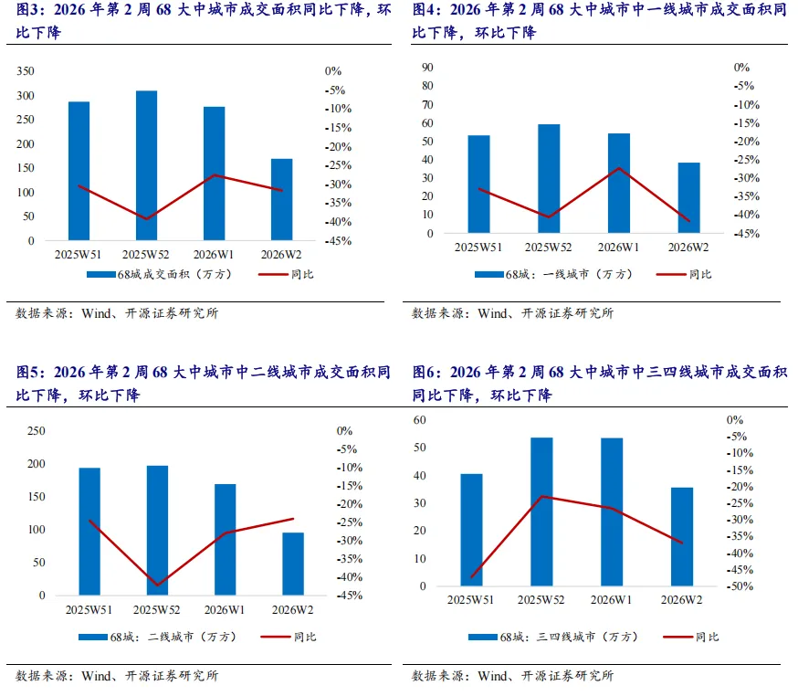 根据房管局数据,2026年第2周,全国68城商品住宅成交面积170万平米,同比下降32%,环比下降39%;从累计数值看,年初至今68城成交面积达447万平米,累计同比下降29%。