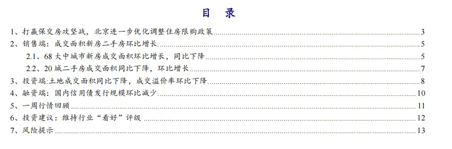 核心观点:二手房成交面积环比增长,打造公平公正市场竞争环境本周我们跟踪的68城新房成交环比下降,同比下降,20城二手房成交面积环比增长,同比下降。土地成交面积同比下降,溢价率环比下降。国内信用债发行规模同比下降。本周财上海住建部提出进一步健全公平竞争审查机制,在政策文件制定和招标文件编制中落实公平竞争审查要求。大力推进异常低价识别和处置,防止“内卷式”竞争。进一步规范工程招标代理行。我们认为,在各项促进房地产市场止跌回稳政策作用下,2025年以来我国房地产市场整体朝着止跌回稳的方向迈进,在止跌回稳的过程中,房价仍可能存在小幅度震荡,期待后续在政策作用下,房地产市场进一步稳定。在更加积极的财政政策、适度宽松的货币政策下,存量收储及城中村改造工作有望加速推进,改善现有住房供求关系,加快止跌回稳进程,维持行业“看好”评级。