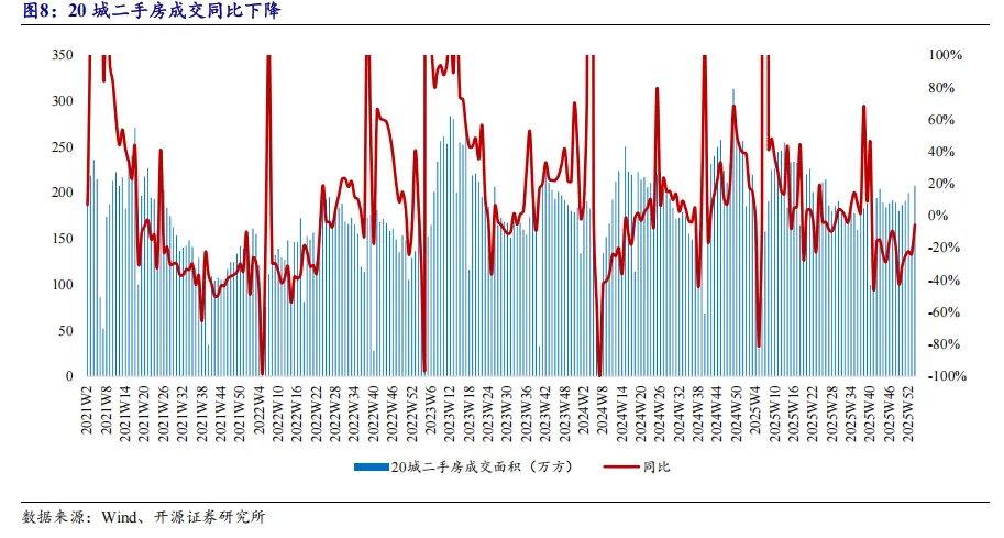 根据房管局数据,2026年第2周,全国68城商品住宅成交面积年初至今累计增速-29%。各线城市走势基本一致,一、二、三四线单周成交同比增速分别为-42%、-24%、-37%,年初至今累计增速-34%、-27%、-37%。2.2、20城二手房成交面积同比下降,环比增长2026年第2周,全国20城二手房成交面积为208万平米,同比增速-6%,前值-24%;年初至今累计成交面积350万平米,同比增速-14%,前值-24%。