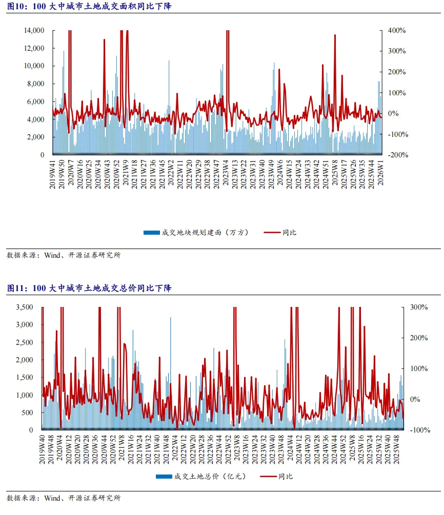 销售端:根据房管局数据,2026年第2周,全国68城商品住宅成交面积170万平米,同比下降32%,环比下降39%;从累计数值看,年初至今68城成交面积达447万平米,累计同比下降29%。全国20城二手房成交面积为208万平米,同比增速-6%,前值-24%;年初至今累计成交面积350万平米,同比增速-14%,前值-24%。