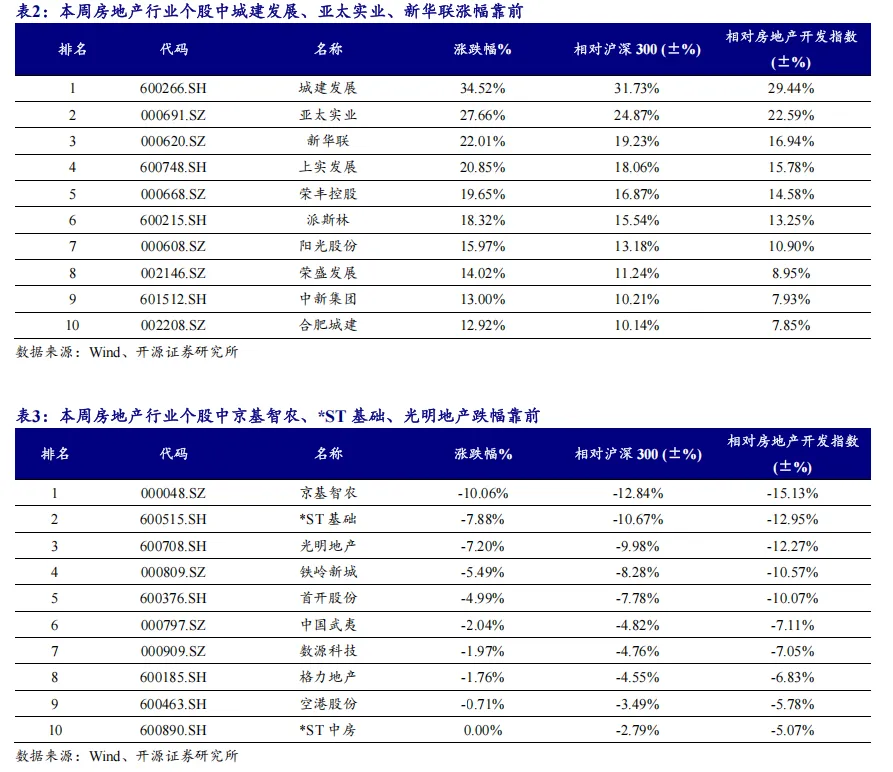 2026年第2周,信用债发行28.8亿元,同比减少73%,平均加权利率2.51%,环比增加30BP。信用债累计发行规模28.8亿元,同比减少74%。5、一周行情回顾板块表现方面,本周(2026年1月5-9日,下同)房地产指数上涨5.07%,沪深300指数上涨2.79%,相对收益为2.29%,板块表现强于大市,在28个板块排名中排第10位。个股表现方面,房地产板块涨跌幅排名前5位的房地产个股分别为:城建发展、亚太实业、新华联、上实发展、荣丰控股,涨跌幅排名后5位的房地产个股分别为京基智农、*ST基础、光明地产、铁岭新城、首开股份。