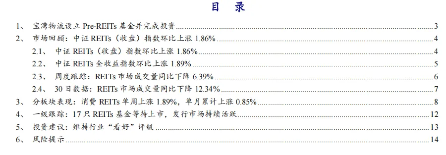 核心观点:消费REITs单周表现优异,发行市场保持活跃2026年第2周,中证REITs(收盘)指数为793.05,同比下跌3.22%,环比上涨1.86%; 中证REITs全收益指数1028.93,同比上涨4.17%,环比上涨1.89%。本周REITs市场交易规模成交量达8.35亿份,同比下降6.39%;成交额达35.51亿元,同比增长0.68%;区间换手率3.01%,同比-2.43pct。本周保障房、环保、高速公路、产业园区、仓储物流、能源、消费类REITs一周涨跌幅分别为-0.24%、+0.85%、+1.23%、+3.14%、+3.79%、+1.59%、+1.89%;一月涨跌幅分别为-1.67%、-0.51%、-4.03%、+3.85%、+4.50%、-2.32%、+0.85%。我们认为,债券市场利率中枢下行压力下,“资产荒”逻辑有望继续演绎,REITs作为高分红、中低风险的资产,在政策力度加强以及社保金和养老金入市预期下,有望持续提升配置性价比,板块具备较好的投资机会,维持行业“看好”评级。一周要闻:宝湾物流设立Pre-REITs基金并完成投资宝湾借助招商证券投行委的专业金融服务优势,携手其子公司招商致远资本、深圳担保集团成功设立招商宝湾深担(佛山)股权投资合伙企业(有限合伙),基金规模5.46亿元,并于2025年12月31日完成对江门鹤山宝湾物流园资产全部交割手续,实现优质资产的高效盘活。合作方表示将以此Pre-REITs为资产孵化平台,持续培育优质物流资产,对接公募REITs市场,提升存量资产流动性与区域物流效率。