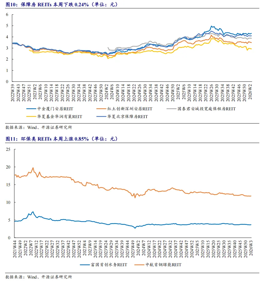 一周行情:保障房REITs单周下跌0.72%,单月累计下跌0.71%2026年第2周,中证REITs(收盘)指数为793.05,同比下跌3.22%,环比上涨1.86%, 2025年年初至今累计上涨0.87%,同期沪深300指数累计上涨19.54%,累计超额收益-18.67%; 中证REITs全收益指数1028.93,同比上涨4.17%,环比上涨1.89%,2025年年初至今累计上涨6.76%,同期沪深300指数累计上涨19.54%,累计超额收益-12.78%。本周保障房、环保、高速公路、产业园区、仓储物流、能源、消费类REITs一周涨跌幅分别为-0.24%、+0.85%、+1.23%、+3.14%、+3.79%、+1.59%、+1.89%;一月涨跌幅分别为-1.67%、-0.51%、-4.03%、+3.85%、+4.50%、-2.32%、+0.85%。