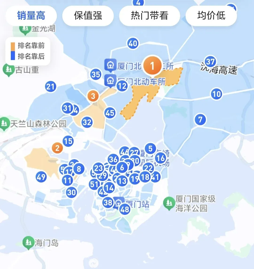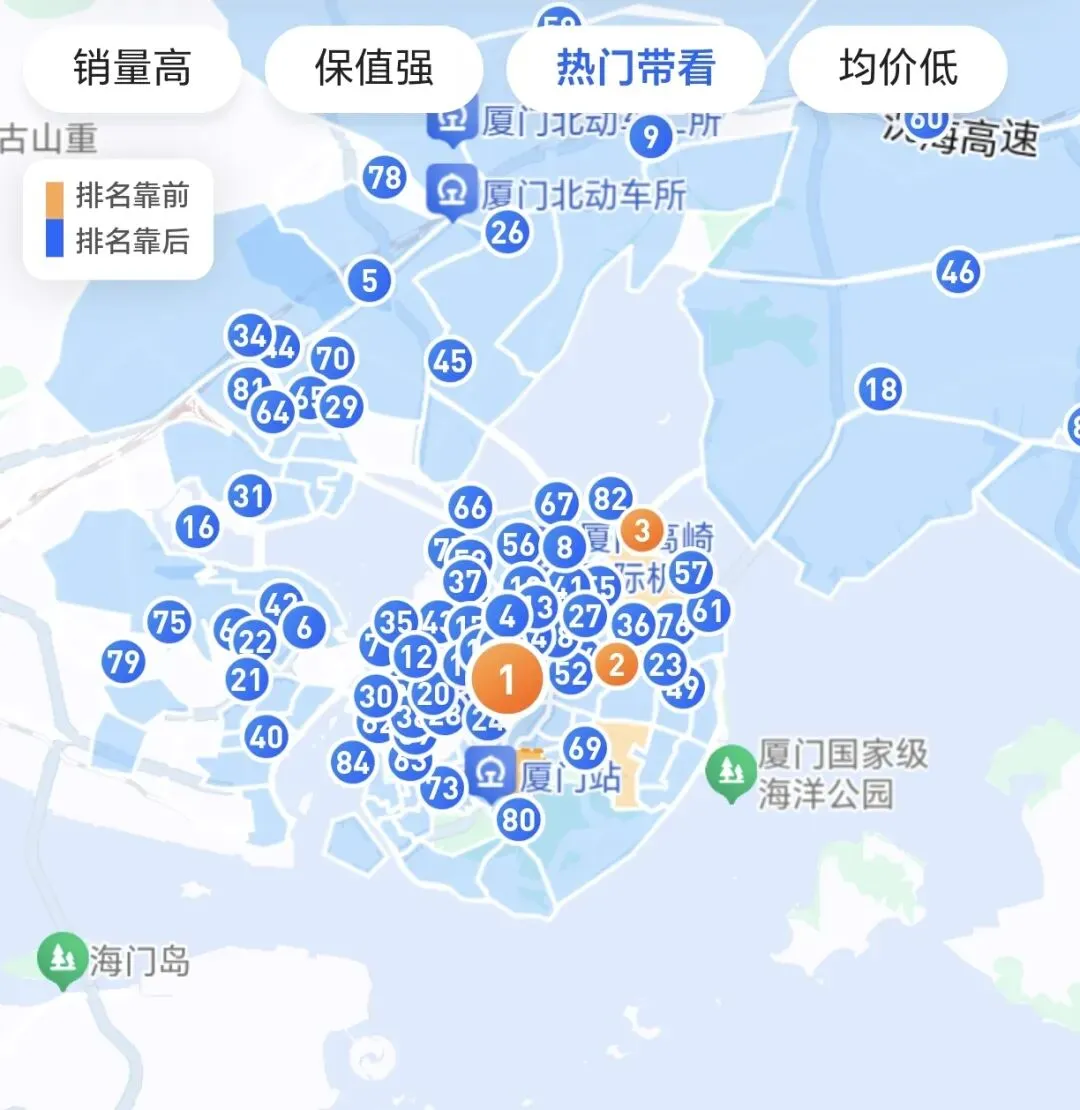 (1)厦门“近7日成交量”前三版块分别是:第一,环东海域(13套);第二,马銮湾中心片区(12套);第三,集美新城(8套)。
