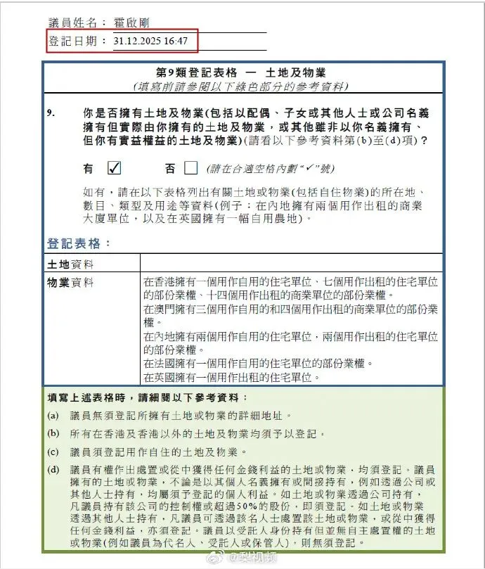 霍启刚在去年最后一天临下班的时候(元旦前夕),即2025年12月31日16时47分,卡点提交了个人财产申报表格(也有拖延症?)!