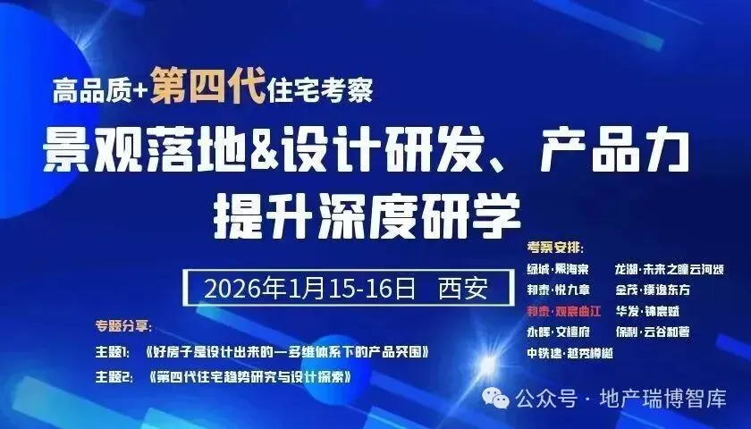 1月15-16日华夏瑞博研学中心再次组织走进西安《高品质+第四代住宅考察:景观落地、设计研发、产品力提升深度研学》探索西安“卷王”楼盘如何以第四代住宅创新突围,学习唐风美学与生态科技融合的落地逻辑,解锁高溢价产品打造方法论!报名咨询:13161942230曹婧