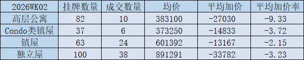 均价相比上一周的40.83W,平均价格调整至37.33W。独立屋2026WK02成交的具体情况: