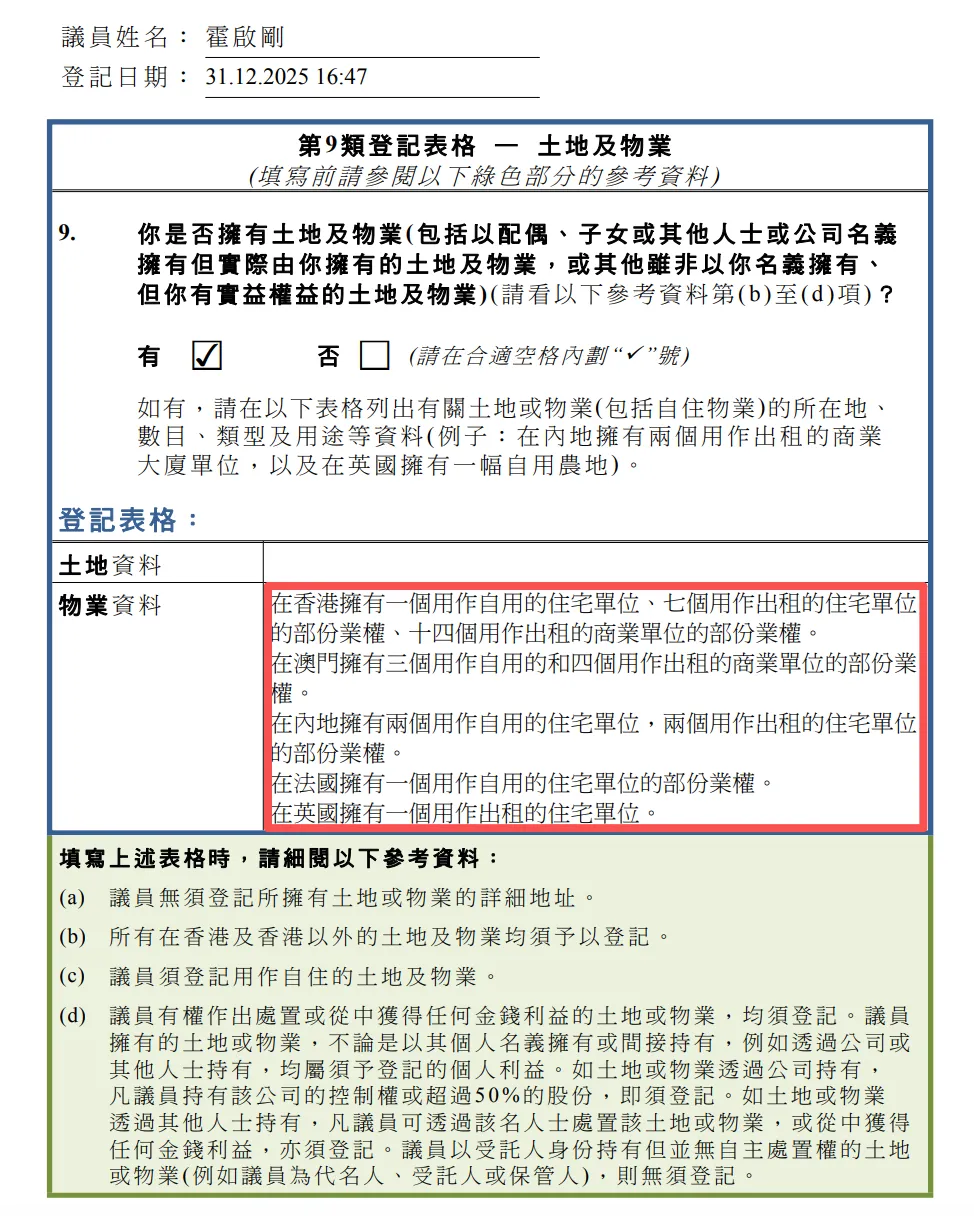其中,连任议员霍启刚以其申报的35处物业引发广泛关注,被网友称为“全球包租公”,更因主动、透明的财产公开态度,获赞“豪门中的清流”。