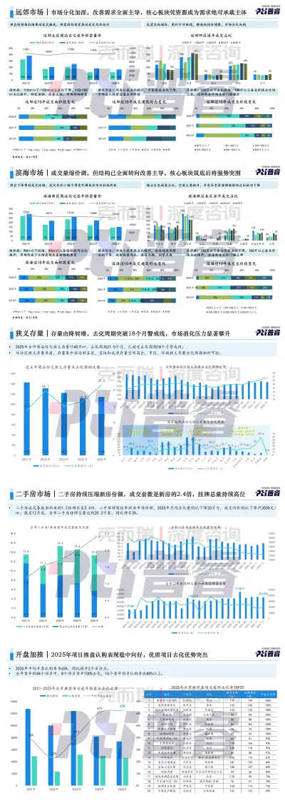 头部项目格局完成深度迭代:从早年全国性房企主导的规模扩张型全域大盘,转向核心板块聚焦的品质深耕模式,市区项目量价齐优、环城主打高性价比大盘、远郊锚定核心板块、滨海由本土资源型国企主导高能级产业配套区域,市场发展逻辑实现从“规模”到“品质”的全面升级。