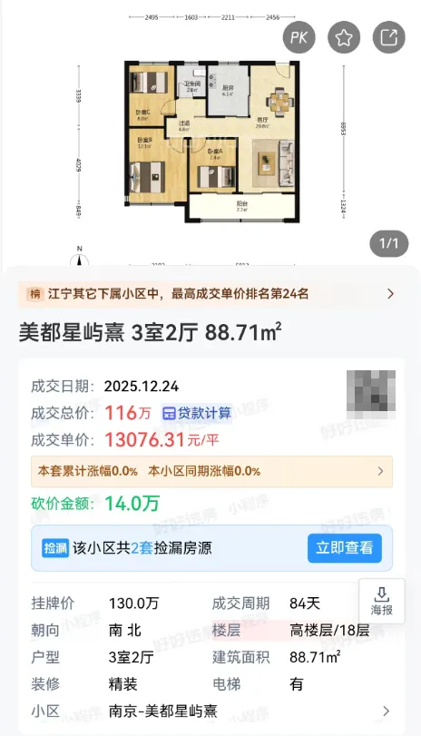 刚刚,我在某二手房平台上看到,该小区成交了一套建面约88.71㎡3室2厅房源,成交总价116万,成交单价约13076元/㎡。