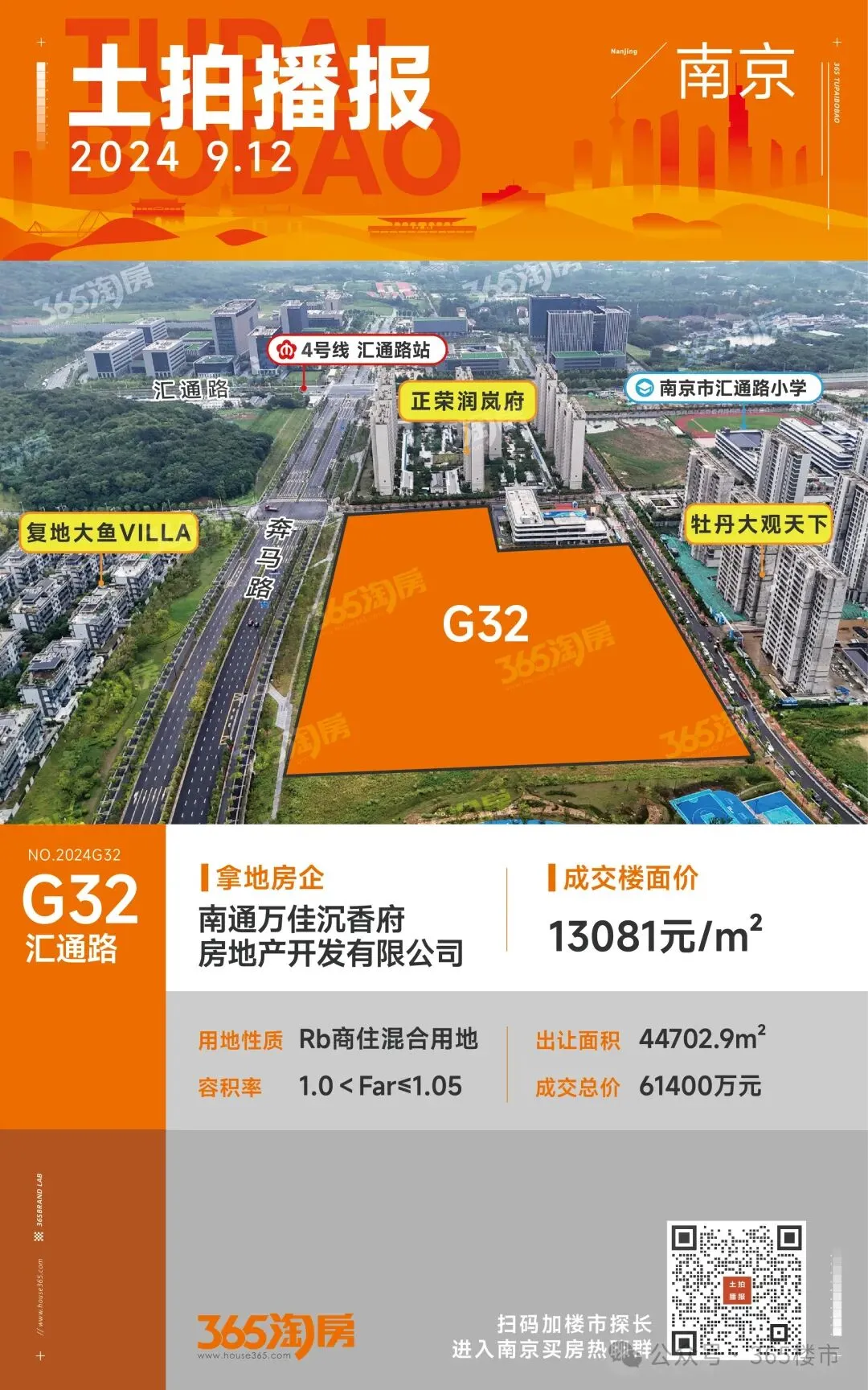 拿地信息回顾:2024年9月12日,NO.2024G32地块经过24轮竞拍,最终以61400万元成交,溢价率高达12.66%,成交楼面价13081元/㎡。拿地房企为:南通万佳沉香府房地产开发有限公司。
