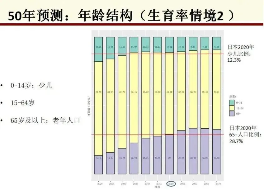 当前中国的人口基数虽然较大,但在低生育率和相对较高的死亡率长期作用下,人口总量将开始快速下降,社会老龄化程度也将极为严重。根据北京大学国家发展研究院张俊妮的研究:如果分年龄生育率和分年龄死亡率保持2023年的水平不变,且不考虑国际移民,83年后(即约2107年)中国人口会回落至4亿左右;届时人口结构将呈现严重的倒金字塔形态,0-14岁儿童占比仅为6.4%,65岁及以上人口占比则高达45.7%(目前65岁及以上人口占比最高的国家是日本,该比例为29.6%)。