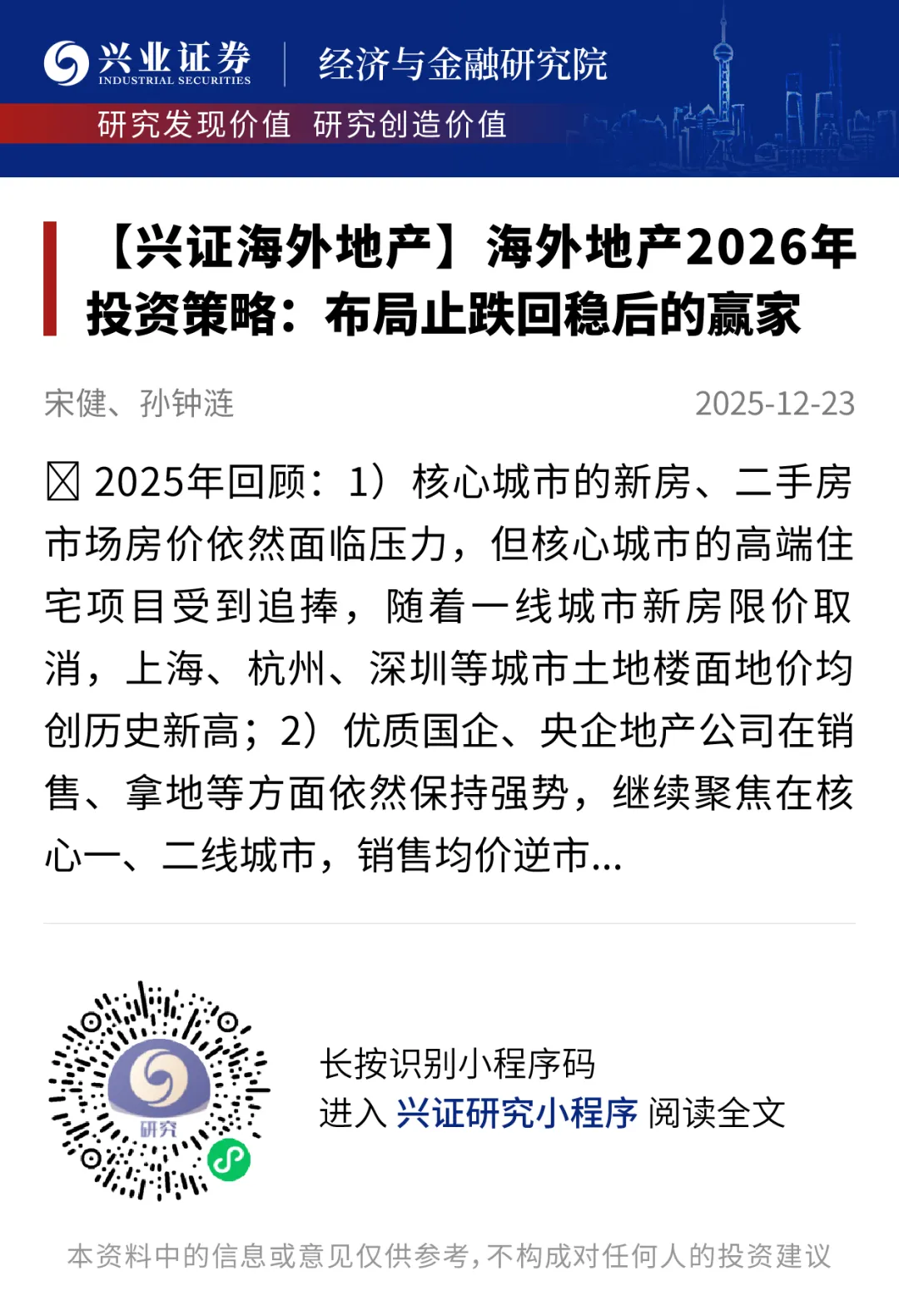 风险提示:宏观经济增长放缓、去库存不及预期、商品房销售不及预期、房价边际改善不及预期、人民币贬值及美联储降息不及预期。注:文中内容依据兴业证券经济与金融研究院已公开发布研究报告,具体报告内容及相关风险提示等详见完整版报告。《【兴证海外地产】海外地产2026年投资策略:布局止跌回稳后的赢家》报告发布机构:兴业证券股份有限公司(已获中国证监会许可的证券投资咨询业务资格)宋健