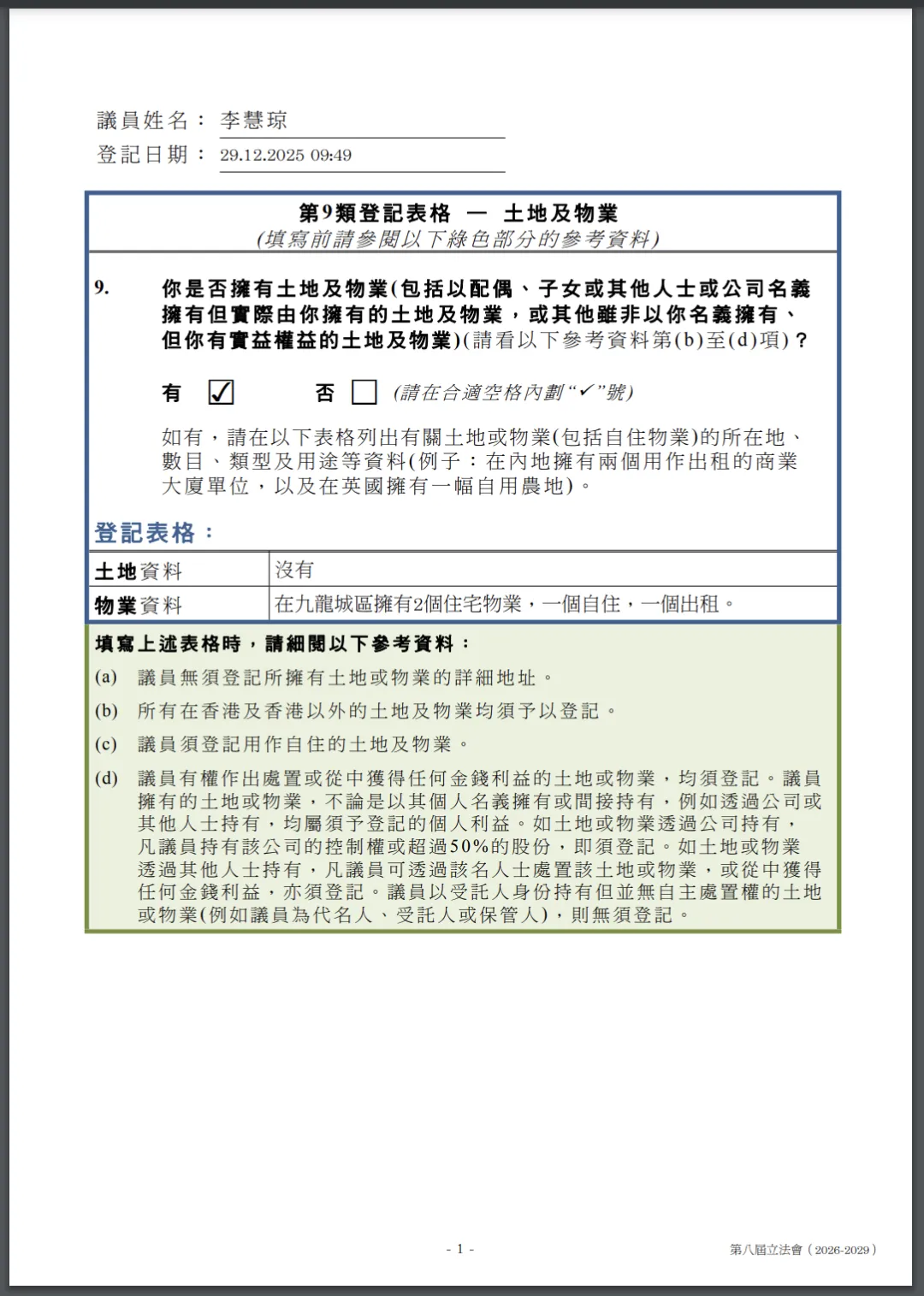 立法会主席李慧琼申报,在九龙城区拥有两处住宅物业,一处自住,一处出租。