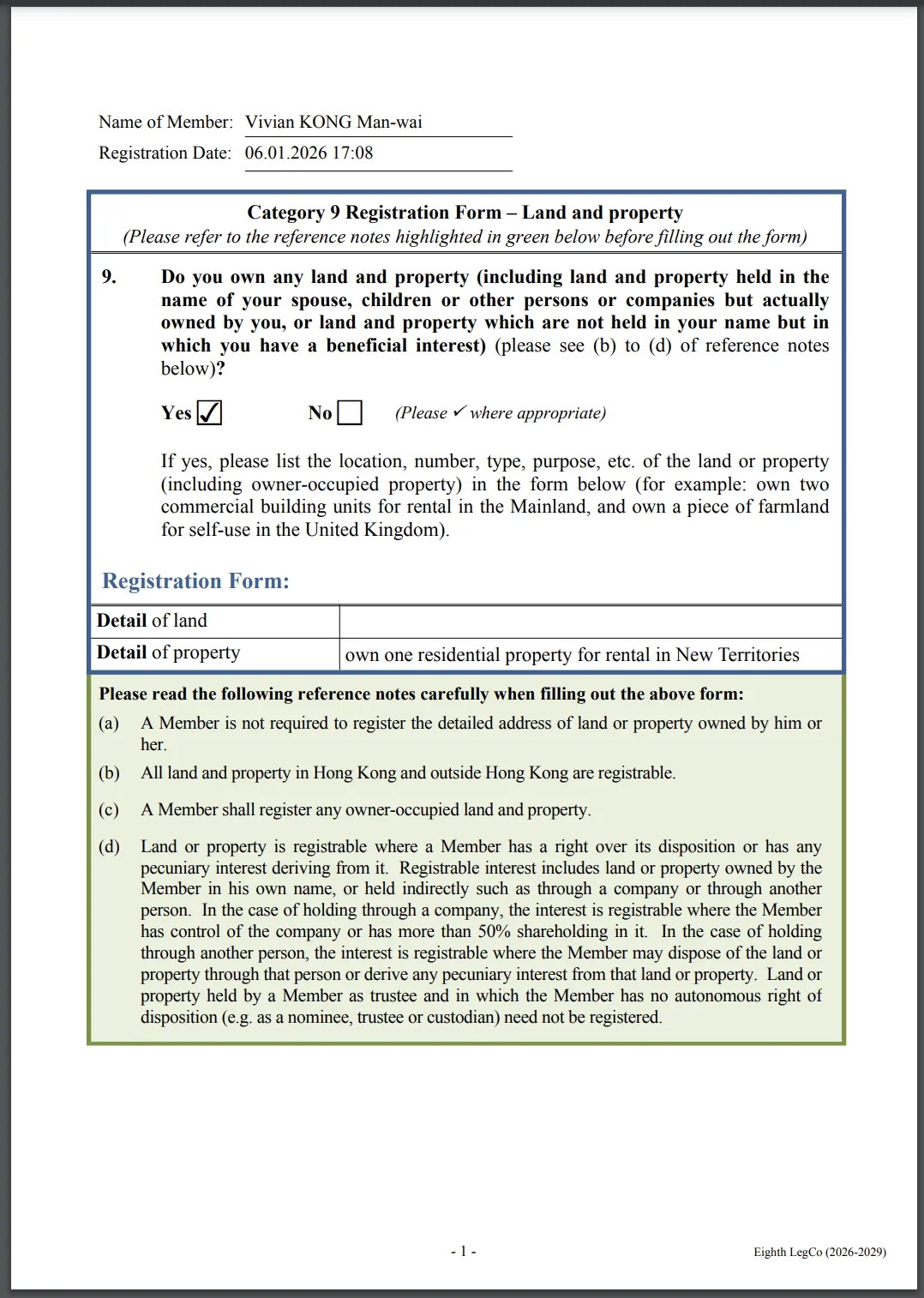 江旻憓财产申报表。来源:香港立法会