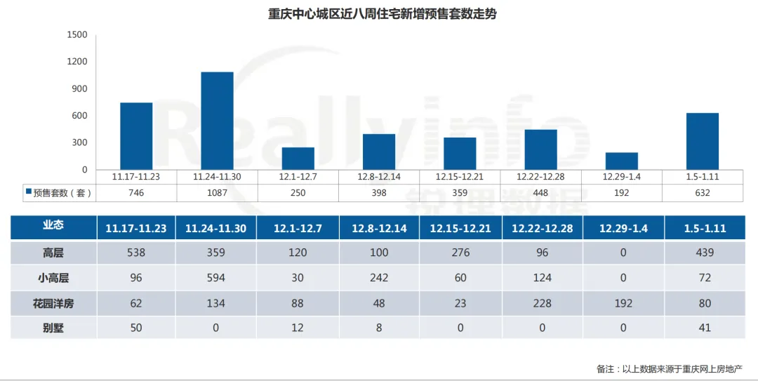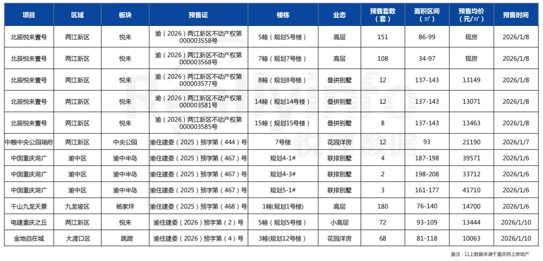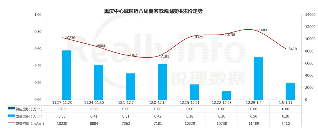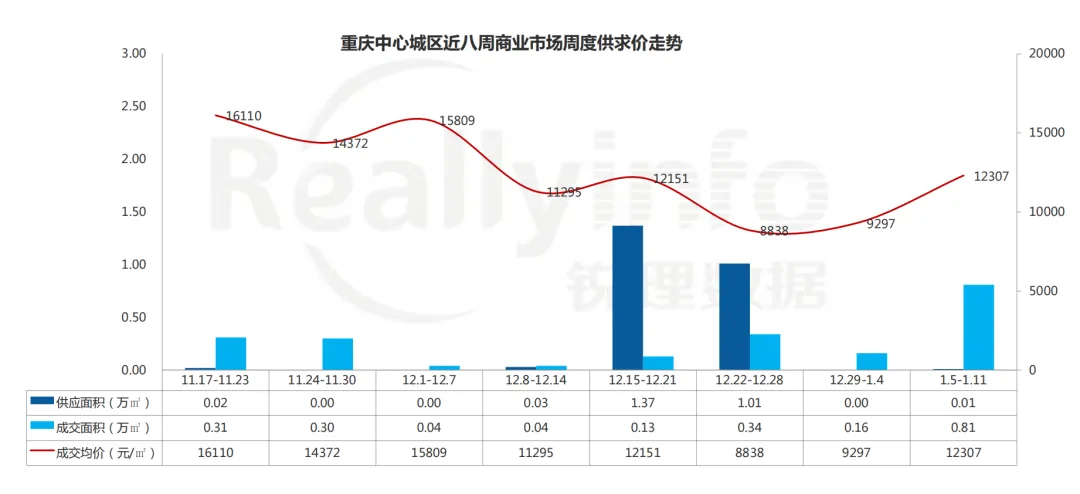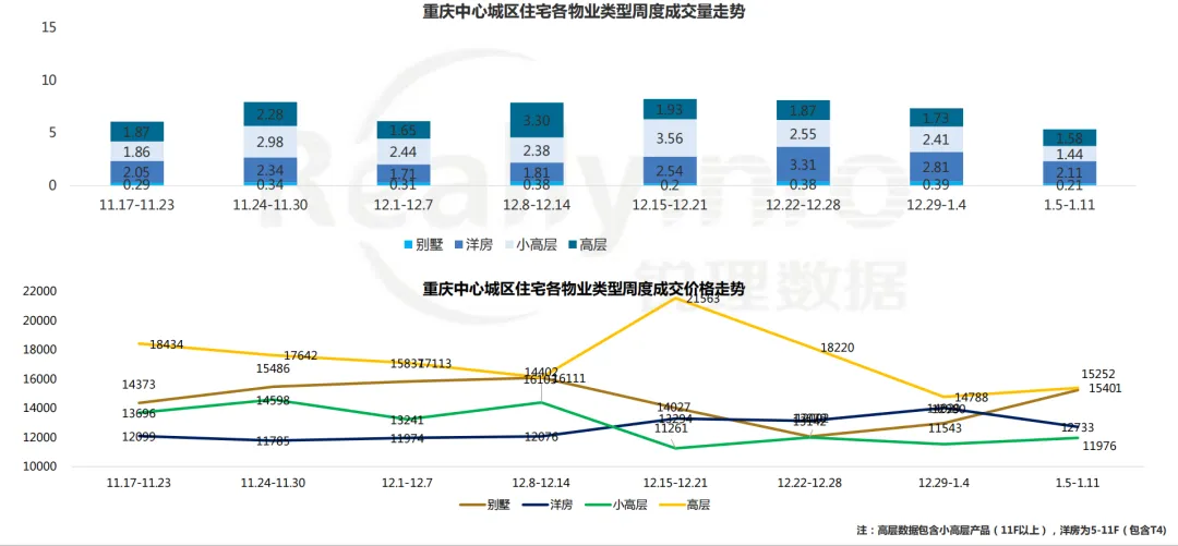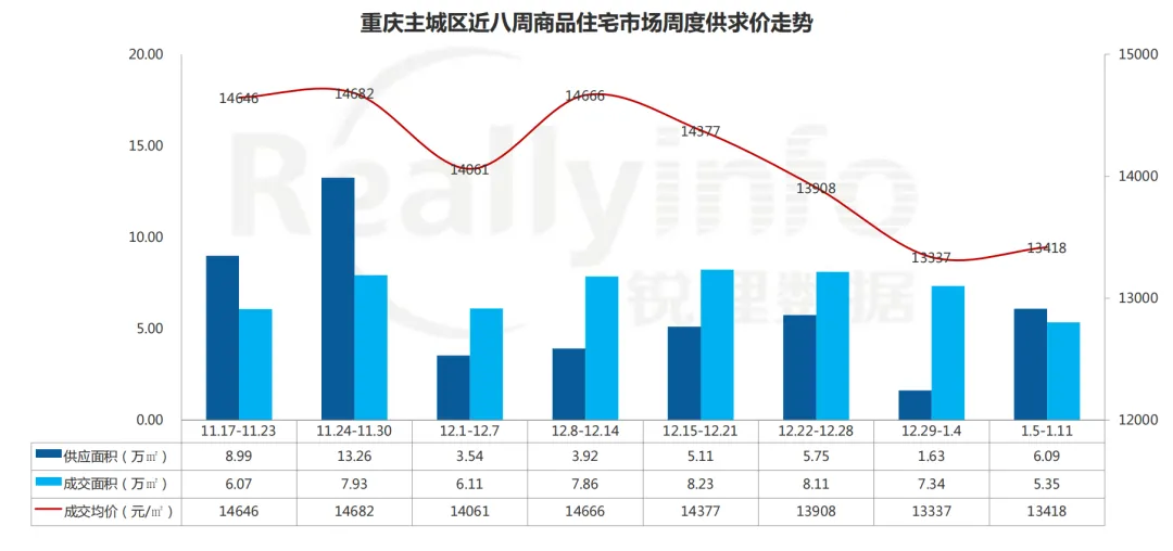 住宅市场:上周重庆中心城区商品住宅供应6.09万方,成交5.35万方,城市核心高层和北区外围项目主导成交,整体均价稳定在13418元/㎡。