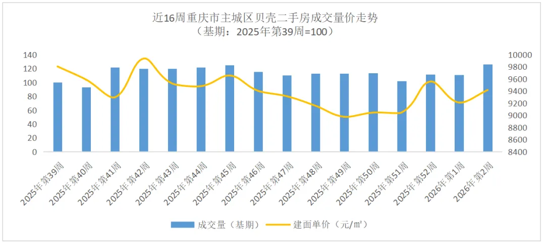 根据贝壳数据监测,重庆市中心城区上周贝壳二手房成交量环比上涨13.7%;成交均价9417元/㎡,环比上涨2.2%;核心区项目成交占比增加,二手成交量价环比上涨。