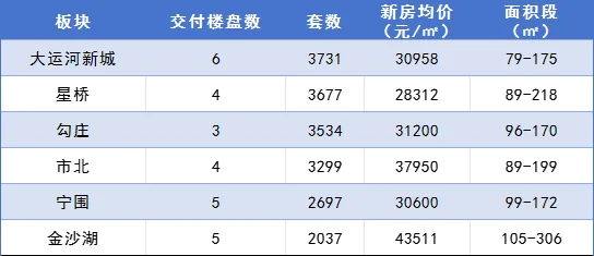 聚焦到具体板块上,交付量在3000套以上的板块有4个,分别是大运河新城、星桥、勾庄和市北,另外,宁围和金沙湖交付套数超2000套。