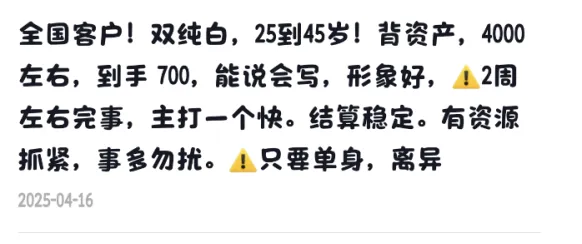 要求是年龄在25到45岁,“纯白户”或者“小白户”。