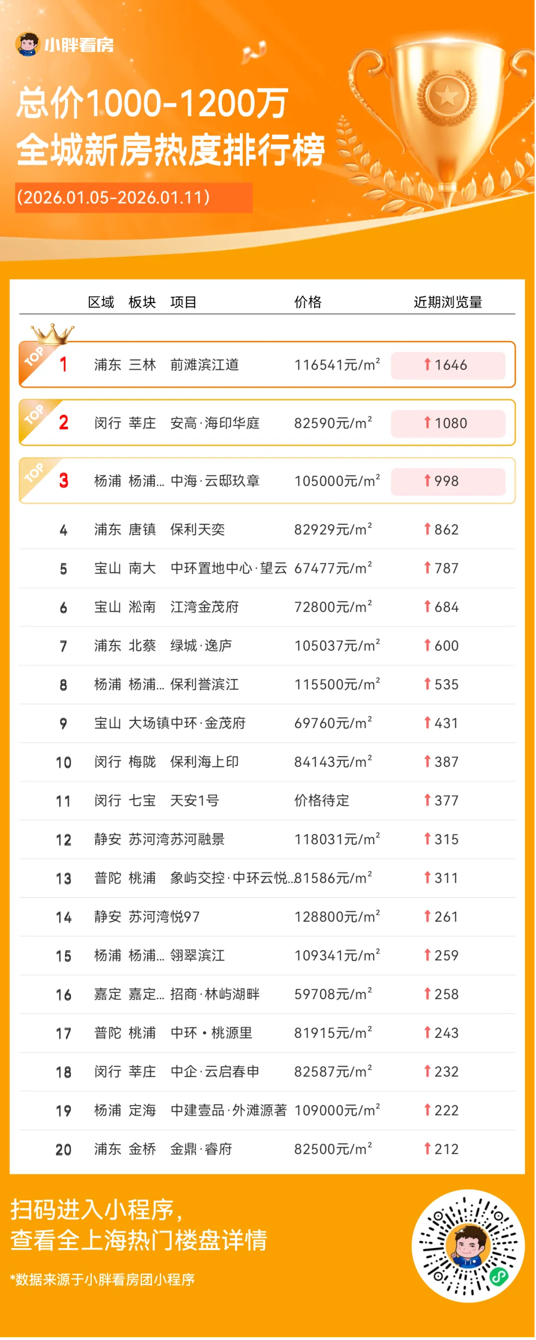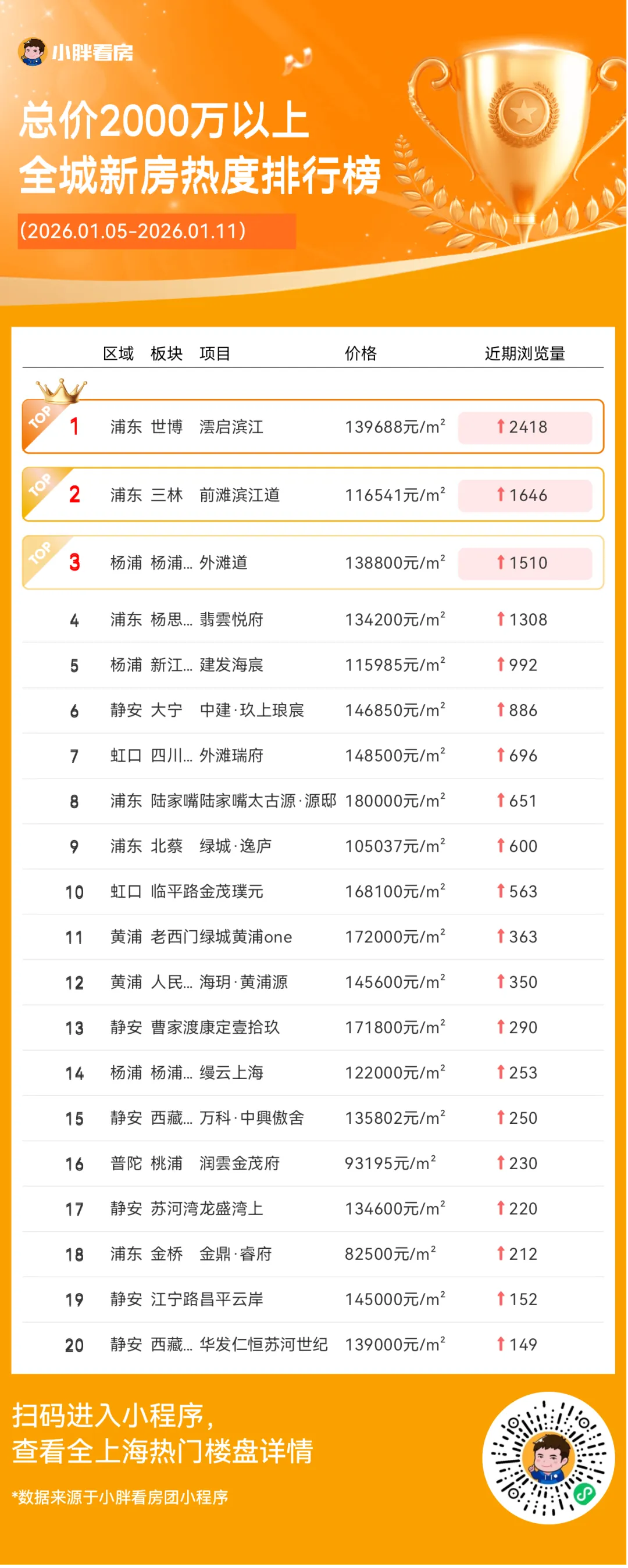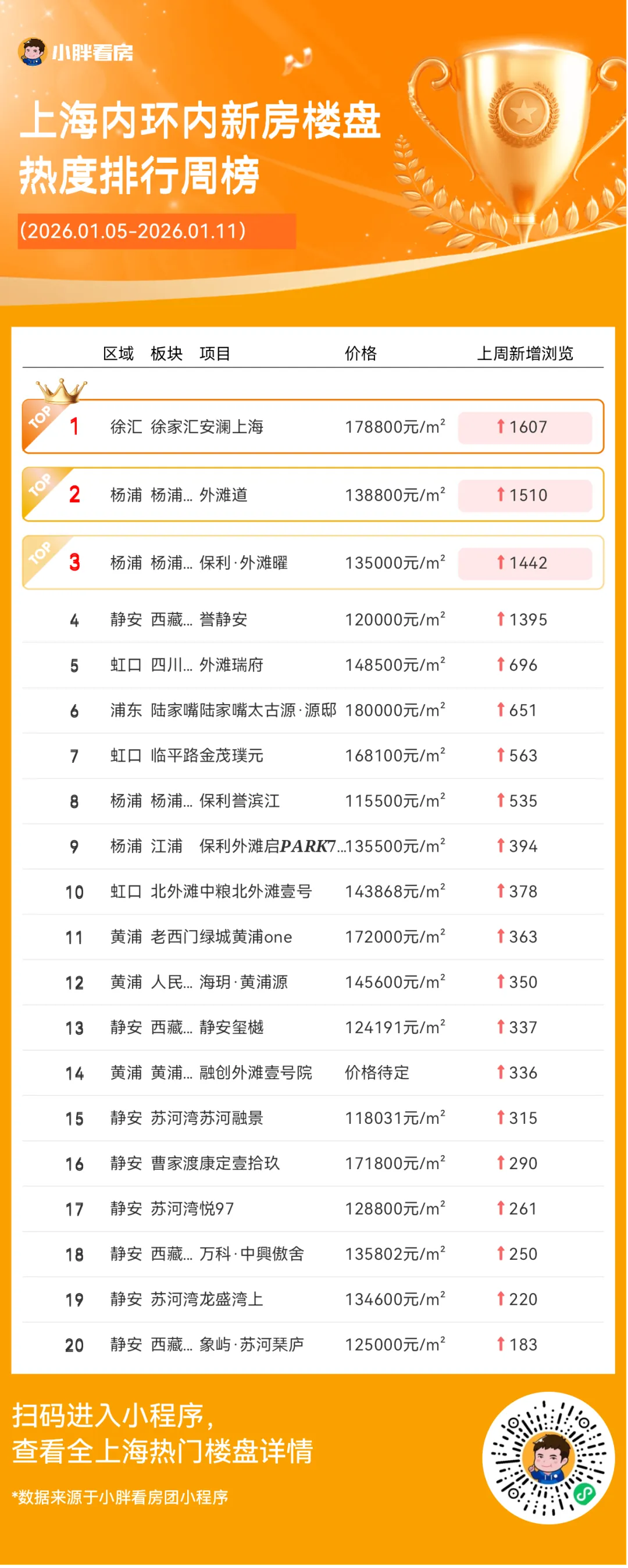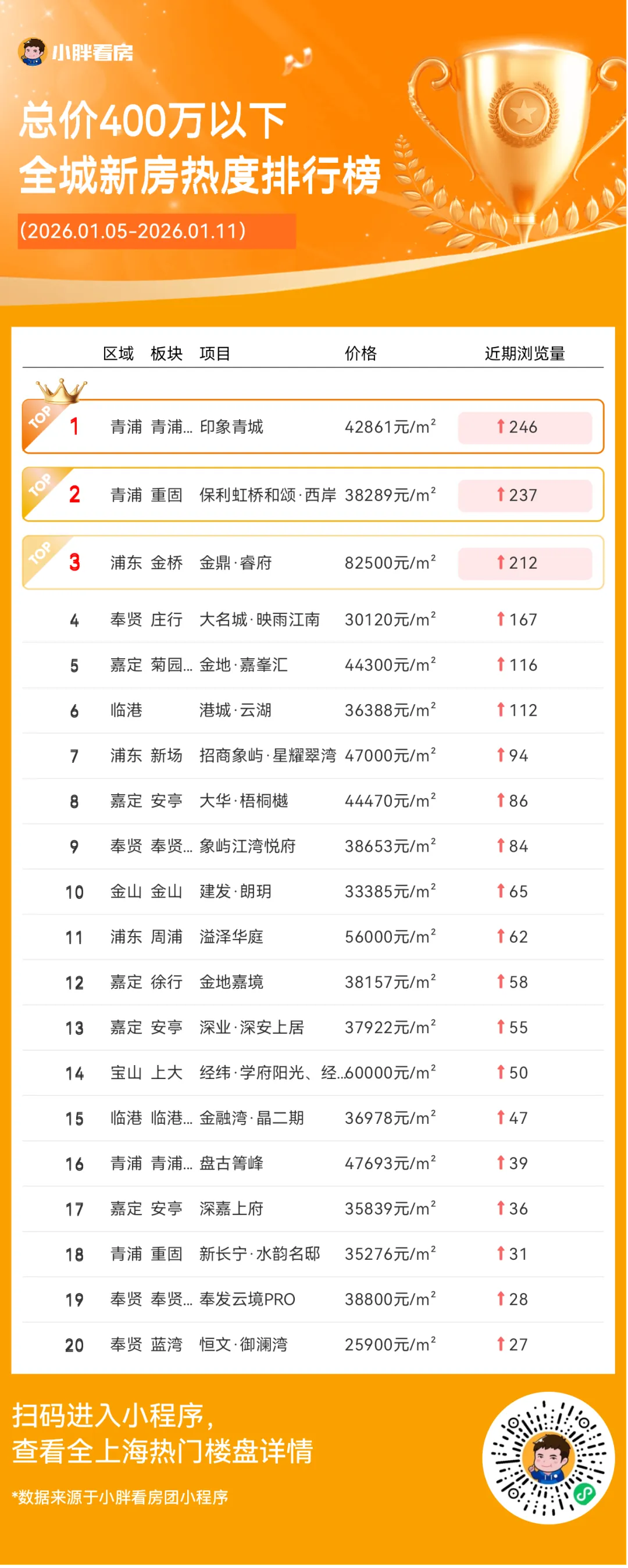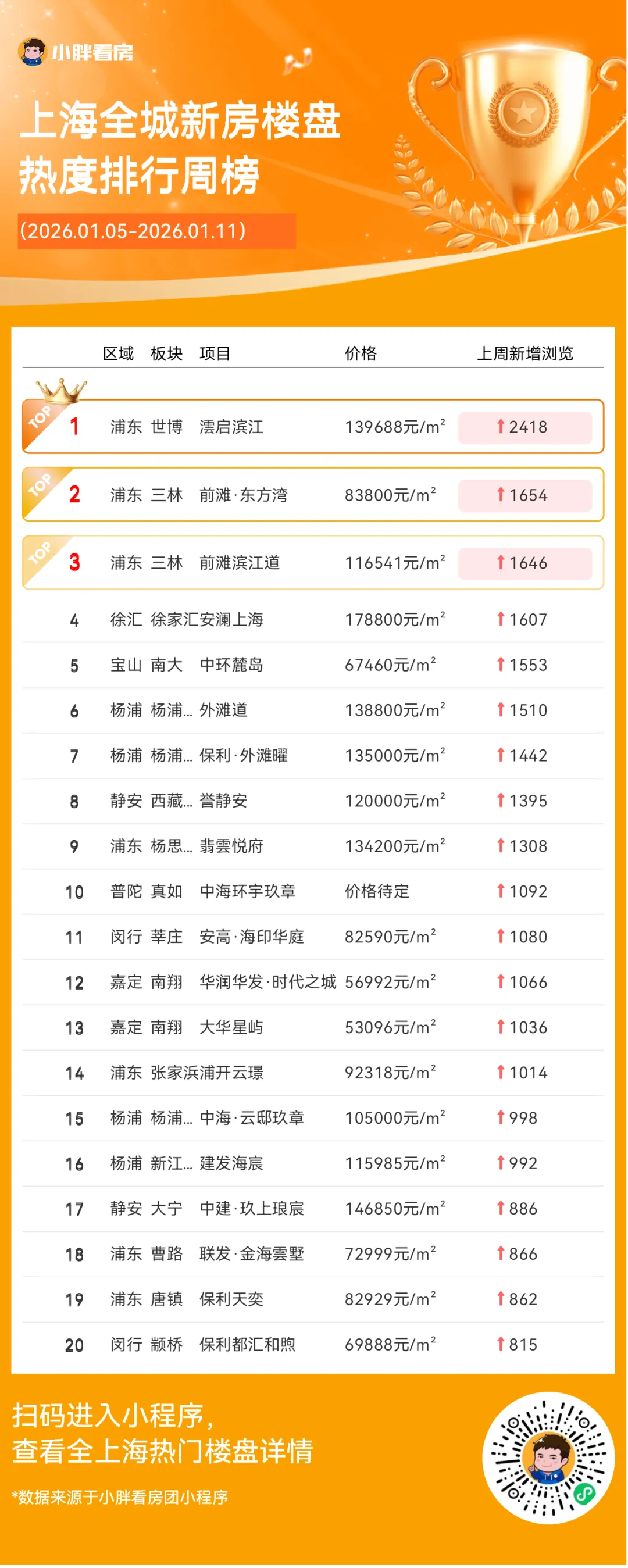 小胖看房团小程序发布一周新房热度榜单(根据新增浏览量排名),分全城榜和总价榜。看看本周谁的人气最高?你心仪的楼盘是否上榜吧~上海二手房最新成交量:昨日(1月11日)网签1037套(含住宅、商业、车位等)。