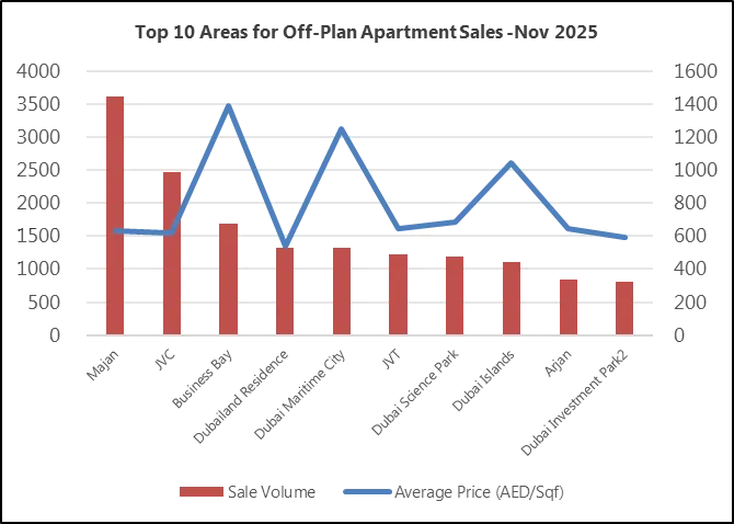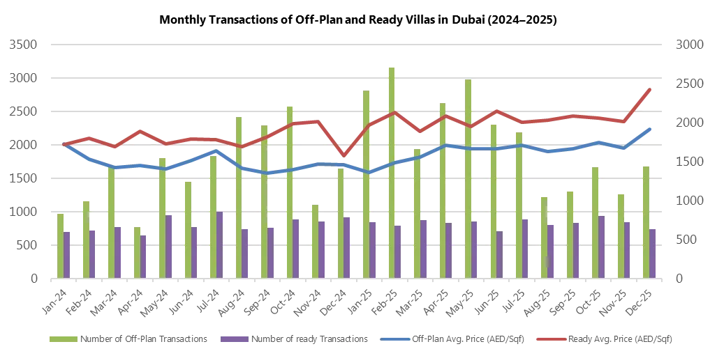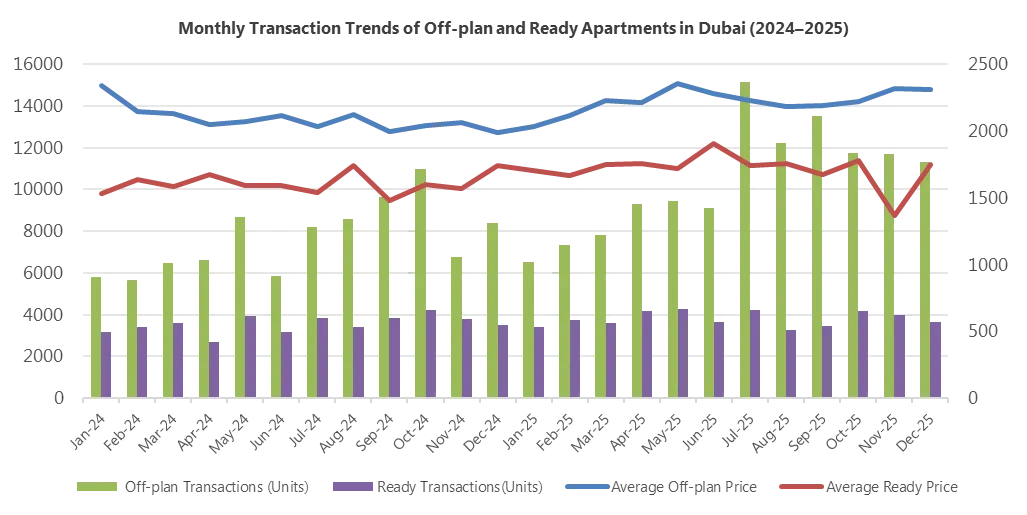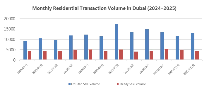 具体到12月住宅市场,呈现"量稳价升"的优质态势。全月住宅成交套数环比增长5%,成交额却大幅攀升11%,均价升至2124 AED/Sqft,创下两年新高。期房依然是市场绝对主力,以75%的成交占比主导格局,12月期房成交量达12996套,同比增长29.8%;现房成交量4369套,虽同比微降0.5%,但均价环比上涨6.1%,价格修复态势显著。