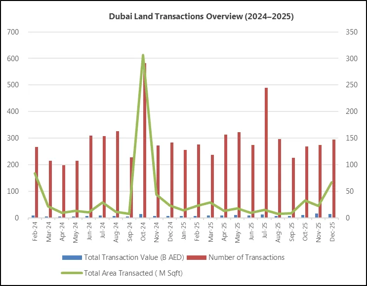 2025年12月土地市场热度不减,成交额达152.06亿迪拉姆,处于近两年区间第二高位。尽管成交宗数仅小幅增长4%,但成交面积同比接近三倍、环比增长两倍以上,凸显年末大体量地块集中成交的特征。从结构来看,土地交易向高价值密度地块倾斜,核心滨海与成熟社区(Umm Suqeim、Jumeirah/La Mer等)维持高价成交,次中心与成长板块以1800-3500 AED/Sqf的开发型地块最为活跃,产业走廊则以功能承载型用地为主,价格由稀缺性、开发强度与用途属性共同决定。