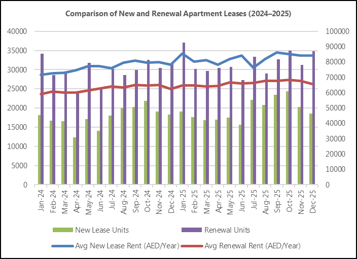 12月租赁市场进入"存量续约期",公寓续签套数34808套,是新签套数的1.87倍,占总套数65%;新签均价84332 AED/年,较续签溢价29%,凸显换租成本与新租价值。户型上,1房是绝对主力,新签端1房贡献36%租金,续签端2房稳定现金流占比40%。