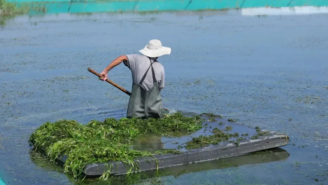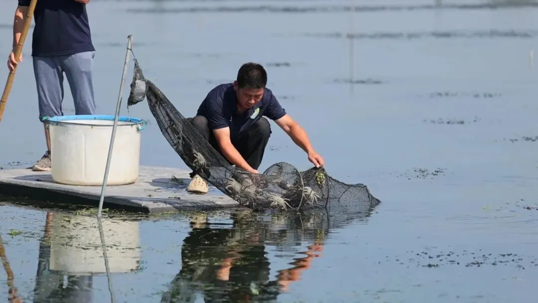 “松江六月黄”的优异品质得益于一以贯之的科学养殖模式。全区各水产专业合作社采用雌雄分养技术以及精细化水草管理,有效净化、改善蟹塘水质。当天,记者就在大泖水产基地看到蟹农正通过调整水草分布密度来有效调节水温。