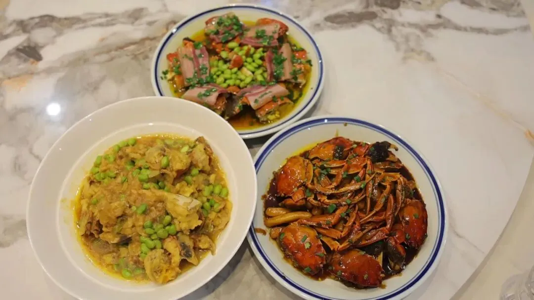 顾红明一边介绍,一边把新鲜捕捞的六月黄送进了昆泖水产基地后厨加工。只见大厨先将六月黄从中间一分为二,蘸取少量面粉锁住蟹黄,用菜籽油炸至金黄,再另起灶与年糕一同翻炒、收汁。很快,这道融合了六月黄鲜香与年糕软糯的佳肴便出锅了。咸肉蒸六月黄更为简单,只需将咸肉与毛豆在蟹上铺开,上屉蒸熟,便能充分释放其鲜甜口感。