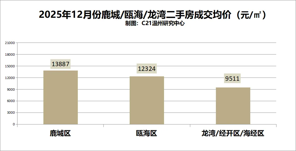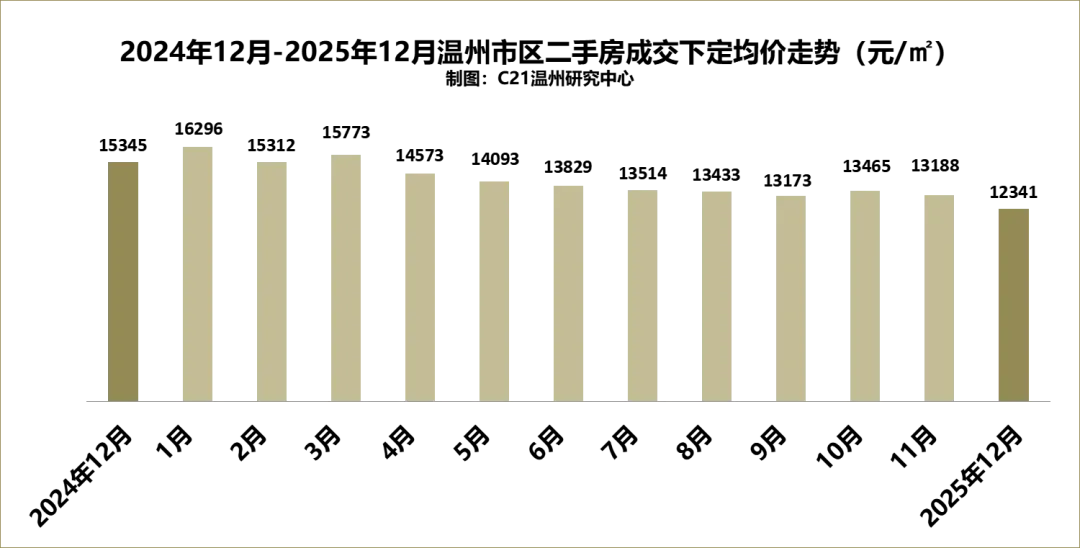 2025年12月,温州市区二手房整体成交均价为12341元/㎡,环比下降6.42%。