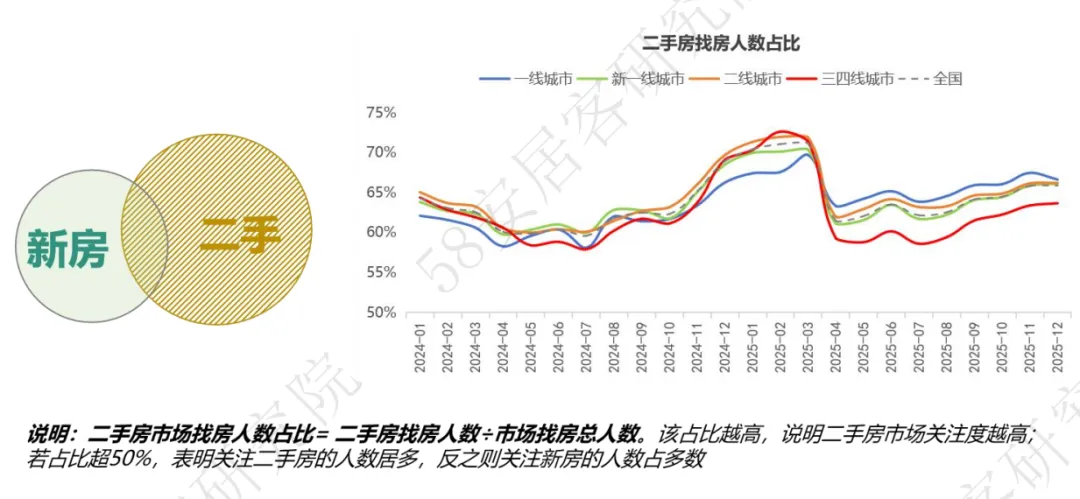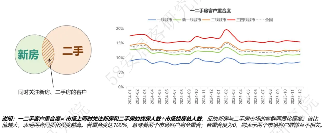 ¡找房倾向趋势:2025年,新房与二手房市场持续分化,两者客户重合度维持在20%以下。不过,二手房找房人数占比显著上升,达65.4%,较2024年同比增长2.8个百分点,这使得二手房对新房的分流压力增强,同比提升4.4个百分点。城市间分化明显,呈现出“城市能级越高,客户重合度越低、分流压力越小”的特点。