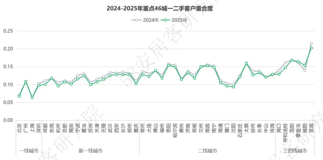 安居客对重点46城的监测数据显示,2025年新房与二手房市场客户重合度月均值为12.4%,较2024年微降0.5个百分点。全年除春节期间升至14.9%外,其余时间均稳定在12%左右。近两年该指标波动小,一二手房客户重合度持续低于20%,表明两个市场客群同质化程度低且长期稳定。