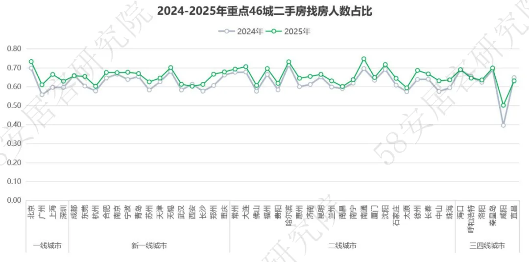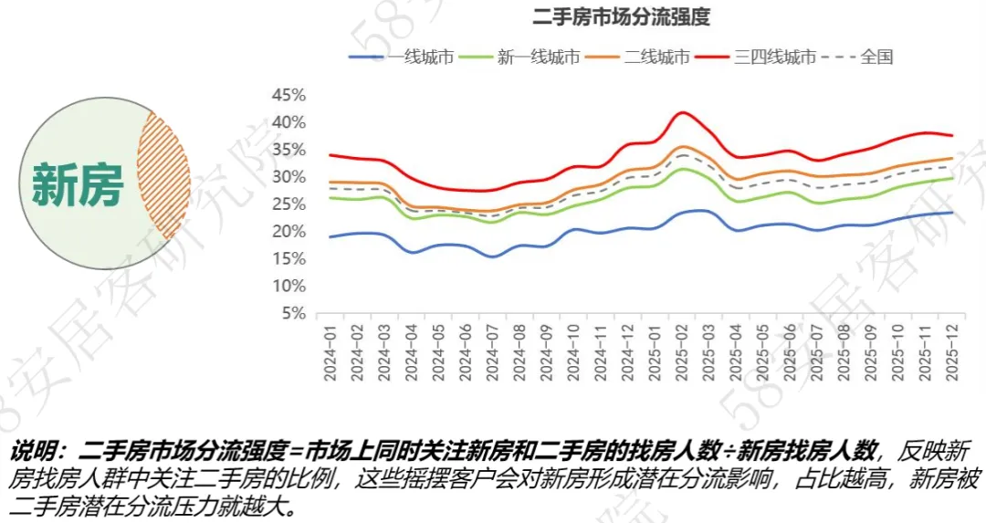 随着二手房找房人数占比上升,其对新房市场的分流压力持续增大。安居客对46个重点城市监测显示,2025年二手房市场分流压力月均值达30.1%,较2024年再升4.4个百分点。