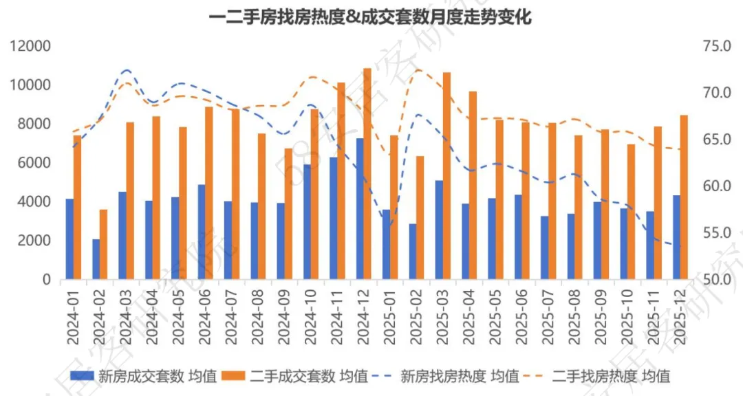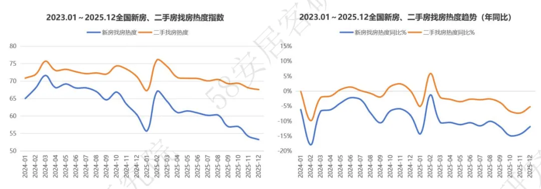 2025年,新房找房热度指数月度均值为59.4,同比降11%;二手房找房热度指数月均为70.4,同比降3%。年同比数据显示,二手房韧性更强,热度降幅小于新房,即二者找房需求虽均下降,但二手房表现优于新房。