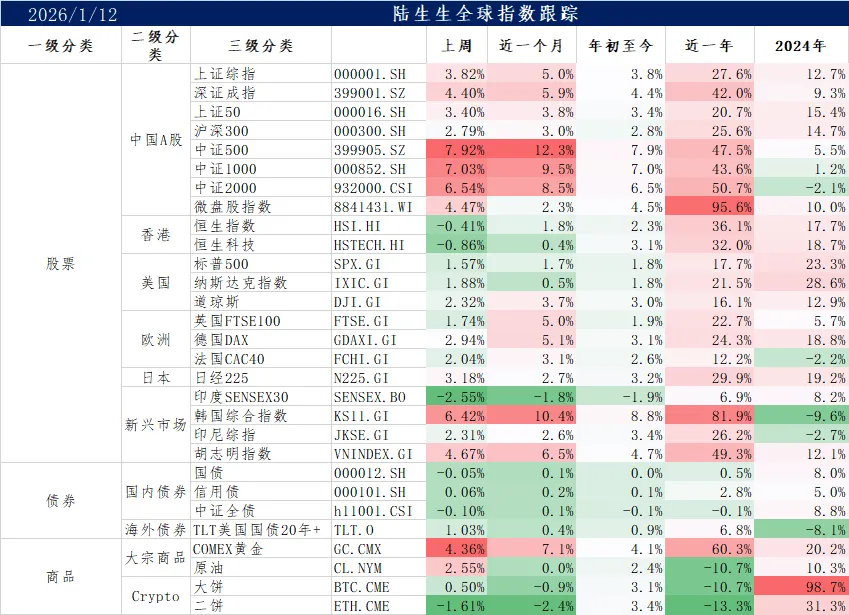 上周全球市场在“美国基本面韧性+地缘扰动”的组合下呈现结构性分化。美国劳动力市场仍保持韧性,失业率小幅回落、薪资同比回升,市场对美联储1月不降息的定价进一步巩固。在财政与货币偏宽松预期下,贵金属在彭博大宗商品指数再平衡阶段维持强势,同时中东地缘紧张与对俄原油制裁预期推升油价。资产表现上,美债收益率小幅回落、美元指数温和走强;权益市场中,韩国、越南、德国表现相对突出,而阿根廷、印度承压。值得关注的是,美股在期限利差走阔、波动率处于低位及估值高企的背景下,继续上行的核心动能更多依赖盈利兑现,若AI产业链节奏不及预期,短期一致性乐观预期仍存在波动风险。资金层面,全球资金阶段性流出美股、流入美债,同时对中国权益维持净流入。