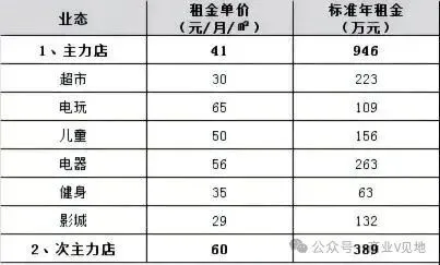 · 主力店平均租金单价41元/月/平米,标准年租金946万元;