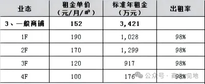· 一般商铺平均租金单价152元/月/平米,标准年租金3421万元;