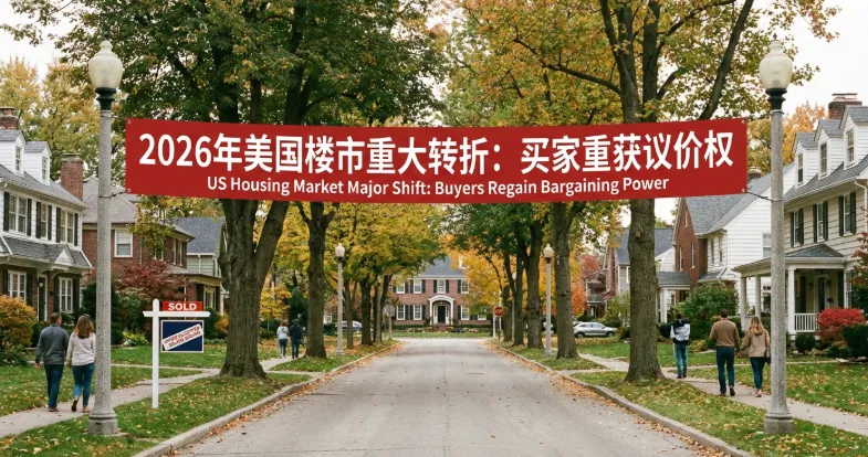 核心速览:2026年美国楼市迎来重大转折,全国82%房产经纪人证实买家重获议价权,住房库存连续24个月增长至$107万套,30年期房贷利率降至6.15%,预计现房销售同比激增14%。