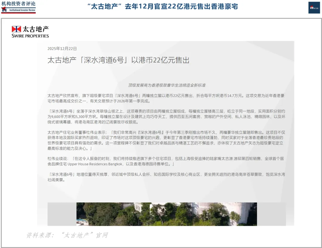 不久前(2025年12月22日),香港“太古地产”官宣售出旗下超级豪宅项目——去年三季度刚推出不久的“深水湾道6号"两幢豪华独立屋(总面积1.49万平方英呎,约合1384平方米),售价22亿港元(约合2.8亿美元、19.7亿元人民币),折合每平方英呎14.7万港元(约合13.1万元人民币),是近年香港豪宅市场最高成交价(单面积价格)之一(交易预计于2026年第一季度完成)。