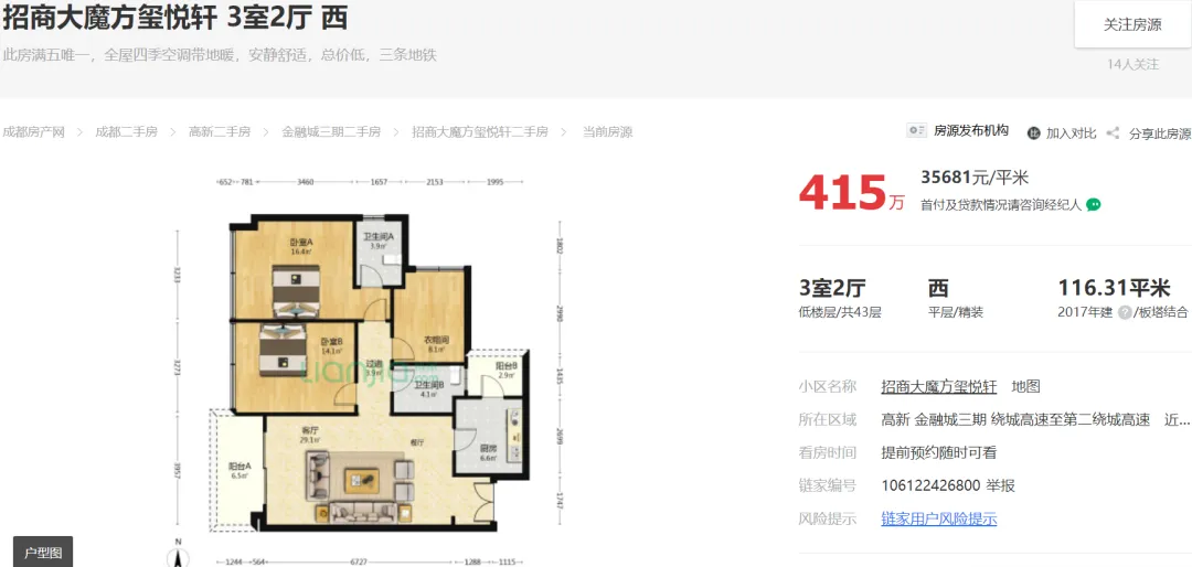 2026年01月11日,据市场端消息:成都高新金融城,招商大魔方玺悦轩建面116平套三报价415万;目前房东心里价在415万愿意出售。