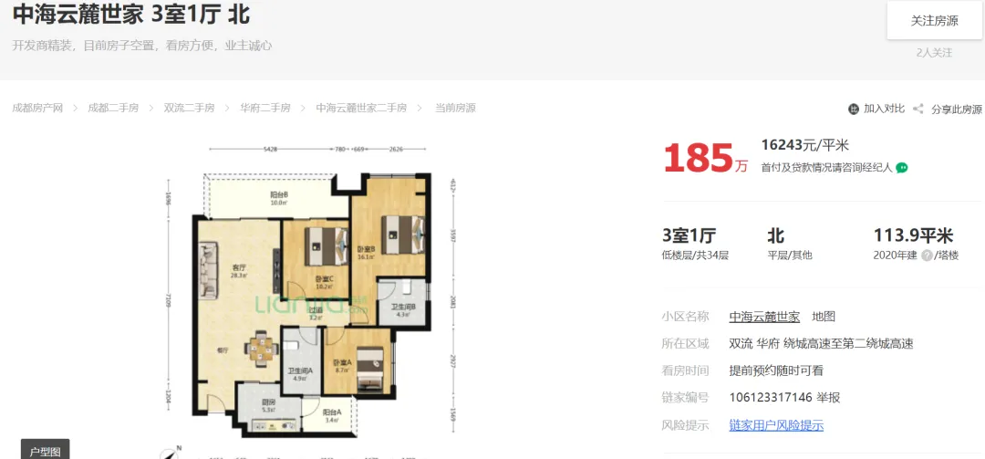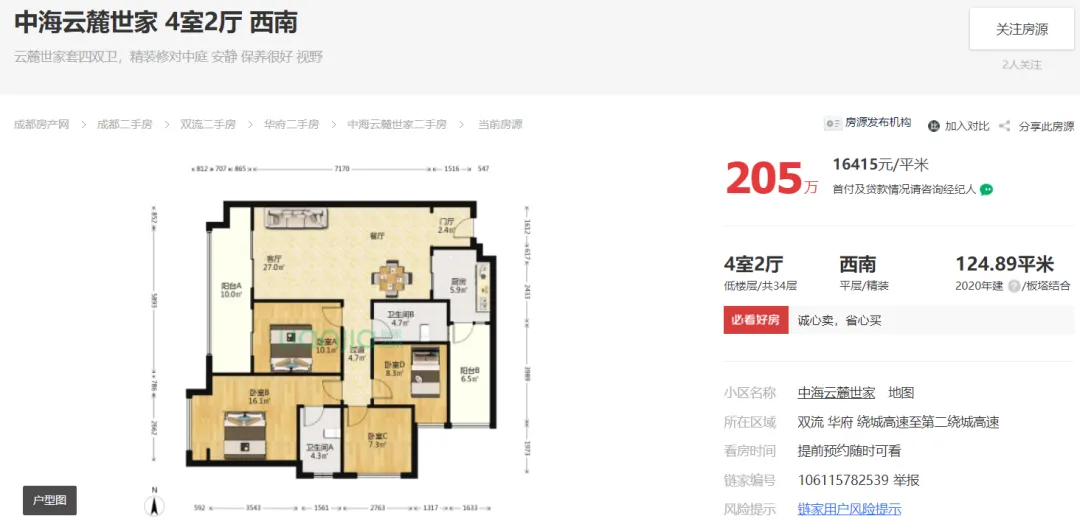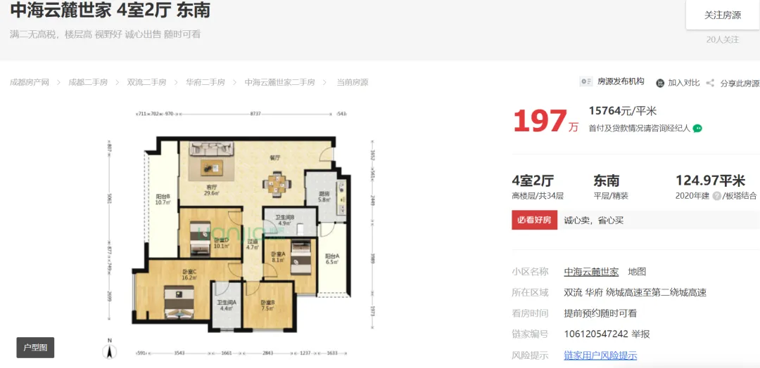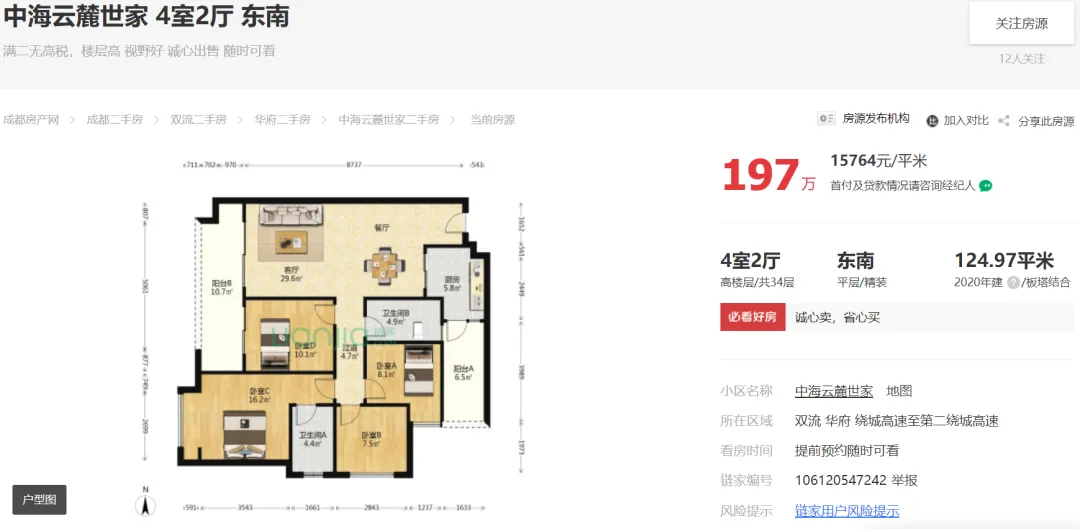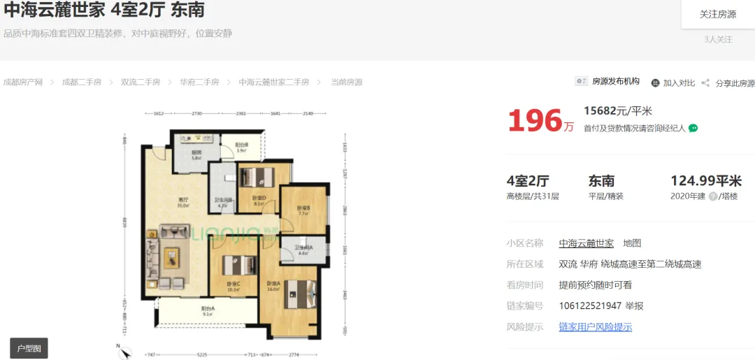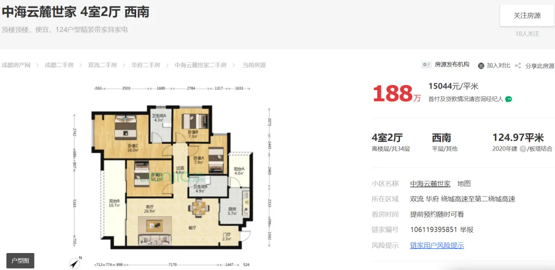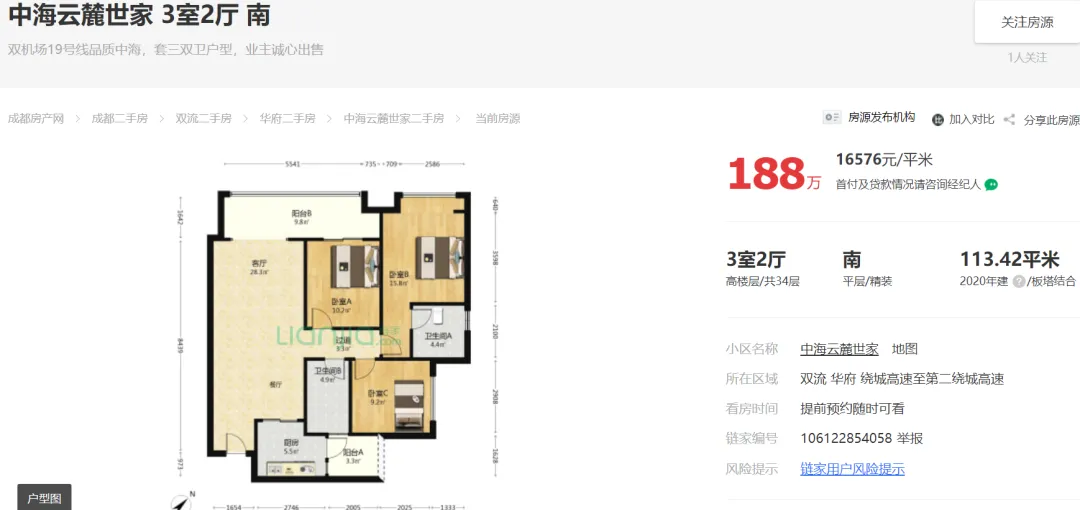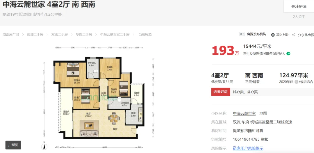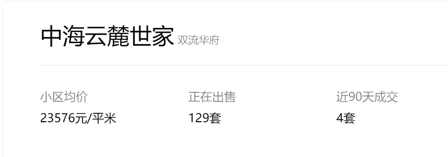 截止2024年11月08日23点,成都“5.31新政”后成都中海云麓世家链家外网挂牌在售住宅129套,最低挂牌单价约15444元/㎡!