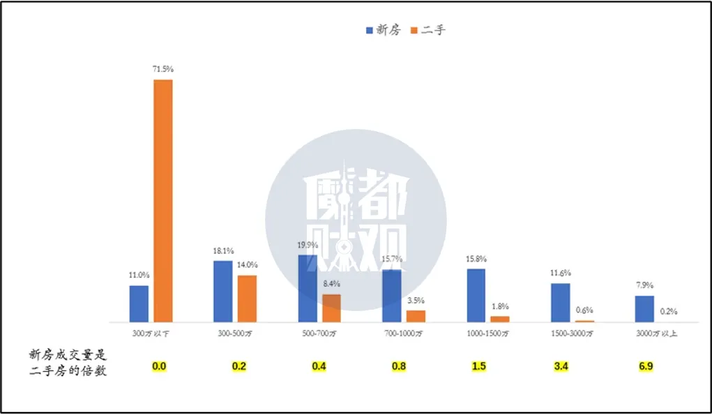 安澜上海(17.88万/平),211套认购327组,售出169套,去化八成,销91亿。华润澐启滨江(14万/平),225套认购218组,售出196套,去化九成。中海寰宇玖章(11.8万/平),90套207认购178清盘,首开日光。绿城黄浦ONE(17.2万/平),56套认购46组,去化七成约39套。中信泰富外滩道(13.88万/平),119套132认购,售出109套,去化九成。联发时光新澍(3.8万/平),184套93认购,售出131套,去化七成。你会发现新开盘的项目不仅单价高,而且总价贵,但偏偏卖的都很好。可是到了二手市场,主力成交全都在500万甚至300万以下,而且总价越低越受欢迎。上海的新房和二手房,感觉彻底活在了两个不同的世界里。而这两个世界的“脱轨”,也让上海买房、卖房、置换变得愈发复杂。房龄超过二十年的老工房,或者房龄十几年的外环小区。85平米左右的两房,单价大概4万,总价340万上下;这恰恰是大多数普通家庭、新上海人“上车”的第一站。中外环附近,120平米的三房,单价8.5万,总价轻轻松松突破1000万;或者内中环地段,105平米的三房,总价也要1100万起步。简单来说,二手房市场还在卖300-500万的“入门券”。尤其是300万以下段位,二手房一年能卖16.5万套,新房几仅有4000套左右。300-500万价位段,10个人里还是有8个人选二手直到700-1000万这个区间,新房和二手才算“有来有回”:但问题是,700-1000万这个价位段的交易,只占上海一二手房总成交量的5%。它根本不是买卖主战场。到了这个价位,新房开始全面主导。特别是1500-3000万的房子,10个买家里只有2个会选二手;3000万以上的顶级豪宅,10个买家只有1个会看二手房——其余9个都直奔新房去了。上海置换卖房,4个月还没卖掉?
