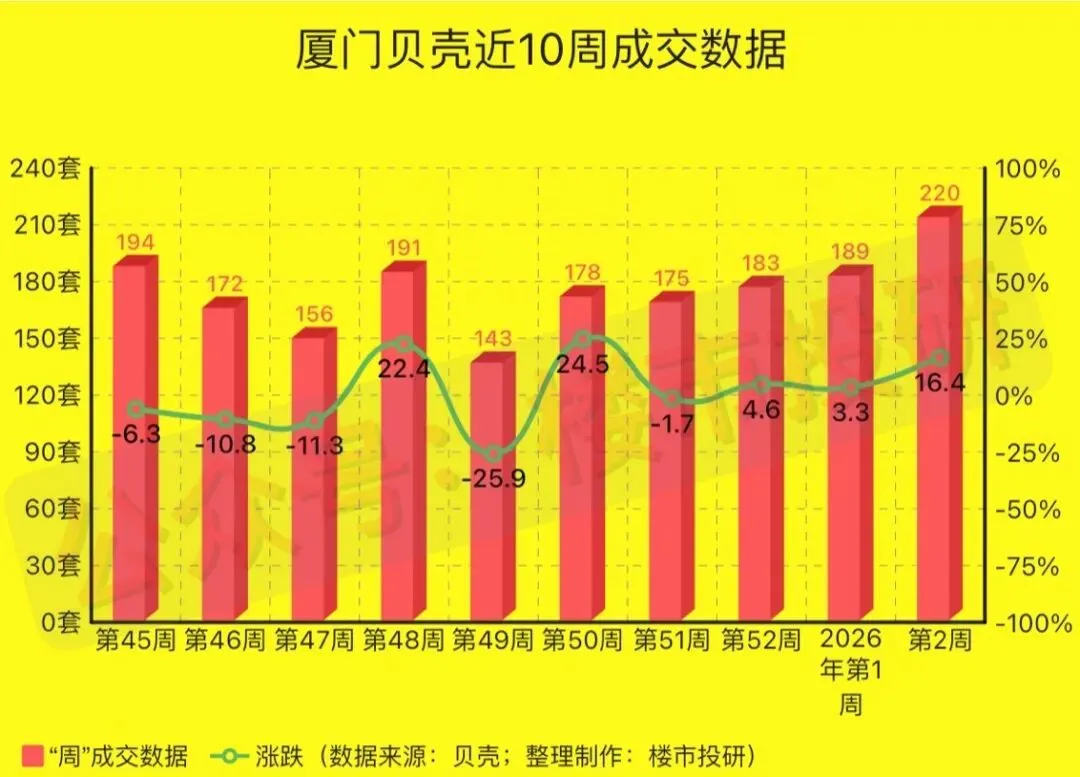 (2)周“二手房成交量”220套,环比上周上涨约16.4%;